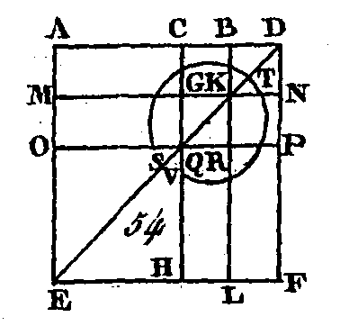 Qu'une droite quelconque AB (fig. 53) soit partagée d'une manière quelconque au point C : je dis que le carré de AB et le carré de BC sont égaux au double du rectangle compris sous AB, BC, et au carré de AC, Sur AB décrivez le carré ADEB (prop. 46. I) et construisez la figure. Puisque le rectangle AG est égal au rectangle GE (prop. 43. I), si nous ajoutons à l'un et à l'autre le carré CF, le rectangle AF sera égal au rectangle CE : donc les rectangles AF, CE sont doubles du rectangle AF; mais les rectangles AF, CE composent le gnomon KLM et le carré CF : donc le gnomon KLM et le carré CF sont doubles du rectangle AF; mais le double du rectangle compris sous les droites AB, BC est double du rectangle AF, car la droite BF est égale à la droite BC (cor. 4. II) : donc le gnomon KLM et le carré CF sont égaux au double du rectangle compris sous les droites AB, BC; donc si nous ajoutons à ces quantités le carré HN, qui est construit sur la droite AC, le gnomon KLM et les carrés CF, HN seront égaux au double du rectangle compris sous AB, BC, et au carré de AC ; mais le gnomon KLM et les carrés CF, HN forment le carré total ADEB et le carré CF qui sont construits sur AB, BC : donc les carrés de AB et de BC sont égaux au double du rectangle compris sous AB, BC, et au carré de AC. Donc si une droite est partagée en deux parties d'une manière quelconque, le carré de la droite entière et le carré de l'un de ses segments sont égaux au double du rectangle compris sous la droite entière et ce segment, et au carré de l'autre segment ; ce qu'il fallait démontrer. PROPOSITION VIII.THÉORÈME.Si une droite est partagée en deux parties d'une manière quelconque, le quadruple du rectangle compris sous la droite entière et un de ses segments, avec le quatre de l'autre segment, est égal au carré construit sur la droite entière et le premier segment, considérés comme, ne formant qu'une seule droite.