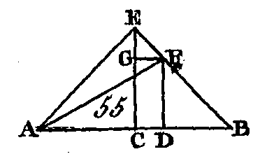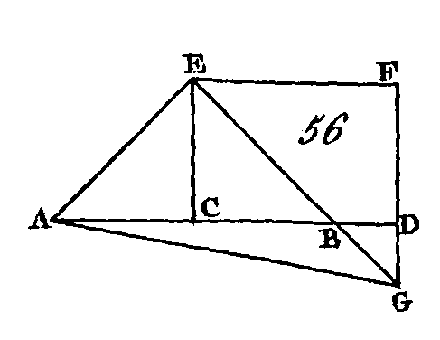 Que la droite AB (fig. 55) soit partagée en deux parties égales au point C et en deux parties inégales au point D : je dis que les carrés de AD, DB sont doubles des carrés de AC, CD. Du point C conduisez une droite CE qui soit perpendiculaire à la droite AB (prop. 11. I) ; faites la droite EC égale à l'une ou à l'autre des droites AC, CB, et menez les droites EA, EB ; par le point D conduisez la droite DF parallèle à la droite EC (prop. 31. I), et par le point F conduisez la droite FG parallèle à la droite AB, et menez la droite AF. Puisque la droite AC est égale à la droite CE, l'angle EAC sera égal à l'angle AEC (prop. 5. I) ; et puisque l'angle ACE est droit, les angles AEC, EAC seront égaux à un angle droit (prop. 32. I); mais ces deux angles sont égaux entre eux : donc chacun des angles AEC, EAC est la moitié d'un angle droit. Par la même raison, chacun des angles CEB, EBC est aussi la moitié d'un angle droit : donc l'angle total AEB est droit. Puisque l'angle GEF est la moitié d'un angle droit et que l'angle EGF est droit, car il est égal à l'angle intérieur et opposé ECB (prop. 29. I), l'angle EFG sera la moitié d'un angle droit : donc l'angle GEF est égal à l'angle EFG : donc le côté EG est égal au côté GF (prop. 6. I). De plus, puisque l'angle EBD est la moitié d'un angle droit, et que l'angle FDB est droit, car il est égal à l'angle intérieur et opposé ECB, l'angle BFD sera la moitié d'un angle droit : donc l'angle FBD est égal à l'angle DFB : donc le côté DF est égal au côté DB (prop, 6. I). Puisque la droite AC est égale à la droite CE, le carré de AC sera égal au carré de CE : donc les carrés de AC, CE sont doubles du carré de AC; mais le carré de EA est égal aux carrés de AC, CE (prop. 47. I), puis l'angle. ACE est droit : donc le carré de EA est double du carré de AC. De plus, puisque EG est égal à GF et que le carré de EG est égal au carré de GF, les carrés de EG, GF seront doubles du carré de GF ; mais le carré de EF est égal aux carrés de EG, GF (prop. 47. I) : donc le carré de EF est double du carré de GF; mais la droite GF est égale à la droite CD (prop. 34. I) : donc le carré EF est double du carré de CD ; mais le carré de AE est double du carré de AC : donc les carrés de AE, EF sont doubles des carrés de AC, CD ; or le carré de AF est égal aux carrés de AE, EF (prop. 47. I) puisque l'angle AEF est droit : donc le carré de AF est double des carrés de AC, CD; mais les carrés de AD, DF sont égaux au carré de AF (prop. 47. I) car l'angle ADF est droit : donc les carrés de AD, DF sont doubles des carrés de AC, CD ; or la droite DF est égale à la droite DB : donc les carrés de AD, DB seront doubles des carrés de AC, CD. Donc si une droite est partagée en deux parties égales et en deux parties inégales, les carrés des deux segments inégaux sont doubles du carré de la moitié de cette droite et du carré de la droite interceptée entre les deux points de section ; ce qu'il fallait démontrer. PROPOSITION X.THÉORÈME.Si une ligne droite est coupée en deux parties égales, et si on lui ajoute directement une droite qui ait la même direction, le carré d'une droite composée de la ligne droite entière et de la droite ajoutée, et le carré de la droite ajoutée, sont doubles du carré de la moitié de cette ligne droite et du carré d'une droite composée de la moitié de cette ligne droite et de la droite ajoutée comme ne faisant qu'une seule droite.
