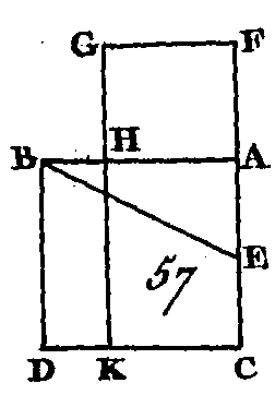 Soit le triangle acutangle ABC (fig. 59) dont l’angle B est aigu du point A conduisez sur la droite BC la perpendiculaire AD : je dis que le carré de AC égale les carrés de CB, BA moins le double du rectangle compris sous les droites CB, BD. Puisque la droite CB est coupée; d’une manière quelconque au point D, les carrés de CB, BD seront égaux au double du rectangle compris sous les droites CB, BD, et au carré de DC (prop. 7. II) : donc si nous ajoutons à ces quantités égales le carré de AD, les carrés de CB, BD, DA seront égaux au double du rectangle compris sous les droites CB, BD, et aux carrés de AD, DC ; mais le carré de AB est égal aux carrés de BD, DA (prop. 47. I), car l'angle ADB est droit, et le carré de AC est égal aux carrés de AD, DC : donc les carrés de CB, BA sont égaux au carré de AC et au rectangle compris sous les droites CB, BD : donc le carré de AC égale les carrés de CB, BA, moins le double du rectangle compris sous CB, BD. Donc dans les triangles acutangles le carré d'un côté opposé à un angle aigu est égal au carré des deux autres côtés qui comprennent l'angle aigu moins le double du rectangle compris sous le côté de l'angle aigu, sur lequel tombe la perpendiculaire abaissée du sommet de l'angle opposé et sous la droite, interceptée entre la perpendiculaire et cet angle aigu.[2] PROPOSITION XIV.PROBLÈME.Construire un carré égal à une figure rectiligne donnée.