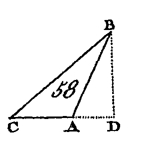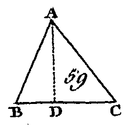 Soit ABC (fig. 58) un triangle obtusangle dont l'angle BAC est obtus; du point B conduisez une perpendiculaire BD sur le côté prolongé CA : je dis que le carré de BC est égal aux carrés de BA, AC, et au double du rectangle compris sous les droites CA, AD. Puisque la droite CD est coupée d'une manière quelconque au point A, le carré de CD sera égal aux carrés de CA, AD, et au double du rectangle compris sous les droites CA, AD (prop. 4. II) : donc si on ajoute à ces quantités égales le carré de DB, les carrés de CD, DB seront égaux aux carrés de CA, AD, DB, et au double du rectangle compris sous les droites CA, AD ; mais le carré de CB est égal aux carrés de CD, DB (prop. 47. I), car l'angle CDB est droit, et le carré de AB est égal aux carrés de AD, DB : donc le carré de CB est égal aux carrés de CA, AB, et au double du rectangle compris sous les droites CA, AD. Donc dans les triangles obtus angles le carré du côté opposé à l'angle obtus est égal aux carrés des deux côtés qui comprennent l'angle obtus et au double du rectangle compris sous le côté de l'angle obtus qui est prolongé jusqu'à la perpendiculaire abaissée du sommet de l'angle opposé et sous la droite interceptée entre la perpendiculaire et le sommet de l'angle obtus ; ce qu'il fallait démontrer. PROPOSITION XIII.THÉORÈME.Dans les triangles acutangles, le carré d'un côté opposé à un angle aigu est égal aux carrés des côtés qui comprennent cet angle aigu moins le double du rectangle compris sous le côté de l'angle aigu sur lequel tombe la perpendiculaire abaissée du sommet de l'angle opposé, et sous la droite interceptée entre cet angle aigu.