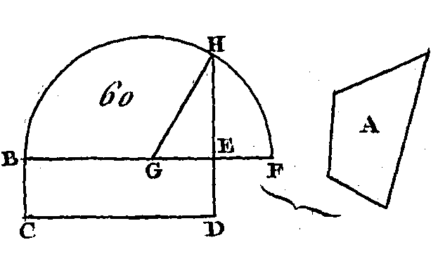 Soit A (fig. 60) la figure rectiligne donnée : il faut construire un carré qui soit égal à cette figure. Construisez un rectangle BD égal à la figure rectiligne donnée A (prop. 45. I). Si le côté BE était égal au côté ED, on aurait déjà fait ce qu'on proposait, car le carré BD aurait été construit égal à la figure rectiligne A. Si, au contraire, l'un des côtés BE, ED est plus grand que l'autre, et si le côté BE est le plus grand, prolongez-le vers F, et faites, EF égal à ED (prop. 3. I); ayant ensuite partagé la droite FB en deux parties égales au point G, du point G et avec un intervalle égal à l'une ou à l'autre des droites GB, GF, décrivez la demi-circonférence BHF (dem. 3), prolongez DE jusqu'en H, et menez la droite GH. Puisque la droite BF est partagée en deux parties égales au point G et en deux parties inégales au point E, le rectangle compris sous les droites BE, EF et le carré de EG, seront égaux au carré de GF (prop. 5. II) ; mais la droite GF est égale à la droite GH : donc le rectangle compris sous les droites BE, EF et le carré de EG seront égaux au carré de GH ; mais les carrés de HE, GE sont égaux au carré de GH (prop. 47. I) : donc le rectangle compris sous les droites BE, EF et le carré de GE, pris ensemble, sont égaux aux carrés de HE, GE : donc, si nous retranchons le carré commun de GE, le rectangle compris sous les droites BE, EF sera égal au carré de EH ; mais le rectangle compris sous les droites BE, EF, est le parallélogramme BD, puisque la droite EF est égale à la droite ED : donc le parallélogramme BD est égal au carré de HE; or le parallélogramme BD est égal, par construction, a la figure rectiligne A : donc la figure rectiligne A est égale au carré construit sur la droite EH. Donc, le carré construit sur la droite EH est égal à la figure rectiligne donnée A ; ce qu'il fallait faire.