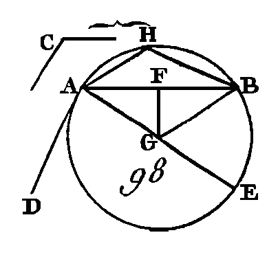 Enfin que l'angle C soit obtus ; sur la droite AB et au point A construisez un angle BAD égal à l'angle C, comme dans la figure 98 (prop. 25. I) et conduisez la droite AE perpendiculaire à la droite AD (prop. 11. I) ; partagez la droite AB en deux parties égales au point F (prop. 10. I) ; du point F conduisez sur AB la perpendiculaire FG, et menez la droite GB. Puisque la droite AF est égale à la droite FB et que la droite FA est commune, les deux droites FA, FG sont égales aux deux droites BF, FG ; mais l'angle AFG est égal à l'angle GFB : donc la base AG est égale à la base GB (prop. 4. I) : donc la circonférence de cercle décrite du point G avec l'intervalle AG passera par le point B. Que cette circonférence ait la position AEB ; puisqu'on a mené la droite AD perpendiculaire à l'extrémité du diamètre AE, la droite AD touchera la circonférence (prop. 16. III), et parce que la droite AB a été menée du point de contact qui est en A, l'angle BAD est égal à celui qui est compris dans le segment alterne du cercle. Mais l'angle BAD est égal à l'angle C : donc l'angle qui est dans le segment AHB sera égal à l'angle C : donc on a décrit sur la droite AB un segment de cercle AHB qui reçoit un angle égal à l'angle C ; ce qu'il fallait faire. PROPOSITION XXXIV.PROBLÈME.D'un cercle donné, retrancher un segment qui reçoive un angle égal à un angle donné. Soit ABC (fig. 99) le cercle donné, et D l'angle donné : il faut du cercle ABC retrancher un segment qui reçoive un angle égal à l'angle donné D.
