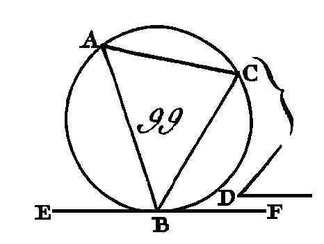 D'un point B conduisez la droite BA perpendiculaire sur EF (prop. 11. I), et dans l'arc BD prenez un point quelconque C et menez les cordes AD, DC, CB. Puisque la droite EF touche la circonférence du cercle AB CD au point B, et que la droite BA a été menée du point de contact B perpendiculaire sur la tangente EF, le centre du cercle AB CD sera placé sur la droite B A (prop. 19. III) : donc l'angle ADB, compris dans le demi-cercle, est droit (prop. 31. III) : donc les angles restants BAD, ABD sont égaux à un angle droit; mais l'angle ABF est droit par construction : donc l'angle ABF est égal aux angles BAD, ABD (ax. 10) : donc si on retranche l'angle commun ABD, l'angle restant DBF est égal à celui qui est compris dans le segment alterne du cercle, c'est-à-dire à l'angle BAD. Actuellement, puisque le quadrilatère ABCD est inscrit dans le cercle, ses angles opposés sont égaux à deux droits (prop. 22. III) : donc les angles DBF, DBE seront égaux aux angles BAD, BCD (prop. 13. I); mais on a démontré que l'angle BAD est égal à l'angle DBF : donc l'angle restant DBE sera égal à celui qui est compris dans le segment alterne du cercle DCB, c'est-à-dire à l'angle DCB. Donc si une droite touche la circonférence d'un cercle, et si du point de contact on conduit une corde, les angles que cette corde fera avec la tangente seront égaux à ceux qui sont compris dans les segments alternes ; ce qu'il fallait démontrer. PROPOSITION XXXIII.THÉORÈME.Sur une droite donnée, décrire un segment de cercle qui reçoive un angle égal à un angle donné. Soit AB (fig. 96, 97, 98) la droite donnée et C l’angle donné : il faut sur la droite donnée AB décrire un segment de cercle qui reçoive un angle égal à l'angle donné C. L'angle C est aigu ou droit ou obtus.
