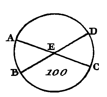 Menez une droite EF qui touche le cercle ABC au point B (prop. 17. III), et sur la droite FE et au point B, pris dans cette droite, faites l'angle FBC égal à l'angle D (prop. 23. I). Puisque la droite EF touche le cercle ABC et que la droite BC a été menée du point de contact B, l'angle FBC sera égal à celui qui est compris dans le segment alterne du cercle BAC (prop. 32. III) ; mais l'angle FBC est égal à l'angle D : donc l'angle qui est compris dans le segment BAC sera égal à l'angle D. Donc d'un cercle donné ABC on a retranché le segment BAC qui reçoit un angle égal à l'angle donné D ; ce qu'il fallait faire. PROPOSITION XXXV.THÉORÈME.Si dans un cercle, deux cordes se coupent mutuellement, le rectangle compris sous les segments de l'une de ces cardes est égal au rectangle compris sous les segments de l'autre. Que dans le cercle ABCD (fig. 100) les deux cordes, AC, BD se coupent mutuellement au point E : je dis que le rectangle compris sous les droites. AE, EG est égal à celui qui est compris sous les droites DE, EB.