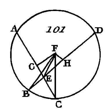 Si les droites AG, BD passent par le centre, de manière que le point E soit le centre du cercle ABCD, il est évident que les droites AE, EC, DE, EB étant égales, le rectangle compris sous les droites AE, EC est égal à celui qui est compris sous les droites DE, EB. Si les droites AC, DB (fig. 101) ne passent pas par le centre, prenez le centre du cercle ABCD (prop. 1. III), que ce centre soit le point F ; du centre F conduisez les droites FG, FH perpendiculaires sur les droites AC, DB (prop. 12. I), et menez les droites FB, FC, FE.