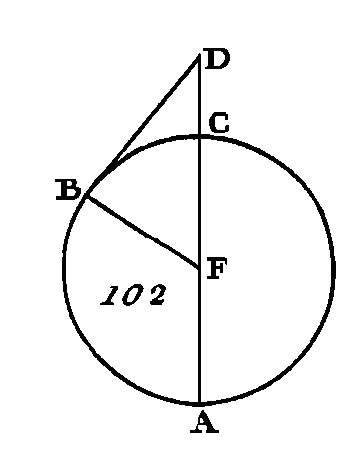 Puisque la droite GF menée par le centre est perpendiculaire sur la droite AG qui n'est pas menée par le centre, la droite GF coupe la droite AC à angle droit, et la partage en deux parties égales (prop. 3. III) : donc la droite AG est égale à la droite GC. Puisque la droite AC est coupée en deux parties égales au point G et en deux parties inégales au point E, le rectangle compris sous les droites AE, EC avec le carré de GE, est égal au carré de GC (prop. 5. II) : donc si nous ajoutons à ces quantités le carré de GF, le rectangle compris sous les droites AE, EC, avec les carrés de GE, GF, est égal aux carrés de CG, GF. Mais le carré de FE est égal aux carrés de EG, GF (prop. 47. I), et le carré de FC égal aux carrés de CG, GF : donc le rectangle compris sous tes droites AE, EC, avec le carré de FE, est égal au carré de FC. Or la droite FC est égale à la droite FB : donc le rectangle compris sous les droites AE, EC, avec le carré de EF, est égal au carré de FB. Par la même raison le rectangle compris sous les droites DE, EB, avec le carré de FE, est égal au carré de FB. Mais on a démontré que le rectangle compris sous les droites AE, EC, avec le carré de FE, est égal au carré de FB : donc le rectangle compris sous les droites AE, EC, avec le carré de FE, est égal au rectangle compris sous les droites DE, EB, avec le carré de FE: donc si on retranche le carré de FE, qui est commun, le rectangle restant compris sous AE, EC sera égal au rectangle restant compris sous DE, EB. Donc si dans un cercle deux cordes se coupent mutuellement, le rectangle compris sous les segments de Tune sera égal au rectangle compris sous les segments de l'autre ; ce qu'il fallait démontrer. PROPOSITION XXXVI.THÉORÈME.Si l’on prend un point quelconque hors d'un cercle, et si de ce point on mène deux droites dont l'une coupe le cercle et dont l'autre lui soit tangente, le rectangle compris sous la sécante entière et le segment extérieur qui est intercepté par ce point et l'arc convexe sera égal au quatre de la tangente. Que hors du cercle ABC (fig. 102) soit pris un point quelconque D, et que de ce point soient menées deux droites DCA, DB; que la droite DCA coupe le cercle ABC, et que la droite AB lui soit tangente : je dis que le rectangle compris sous AD, DC est égal au carré de DB, soit que la droite DCA passe par le centre ou non.