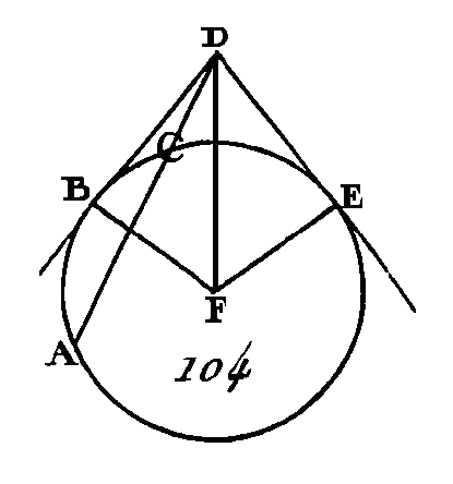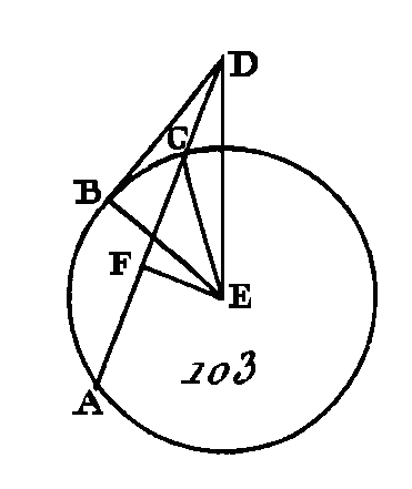 Supposons à présent que la droite DCA (fig. 103) ne passe pas par le centre du cercle ABC ; prenons le centre E, et du point E conduisons sur la droite AC la perpendiculaire EF (prop. 12. I), et menons les droites EB, EC, ED. Puisque l'angle EFD est droit, et que la droite EF menée par le centre coupe à angles droits la droite AC qui n'est pas menée par le centre, la droite EF coupera la droite AC en deux parties égales (prop. 3. III) : donc la droite AF est égale à la droite FC. De plus, puisque, la droite AC est coupée en deux parties égales au point F et que la droite. CD lui est ajoutée, le rectangle compris sous les droites AD, DC, avec le carré de FC, sera égal au carré de FD (prop. 6. II) : donc si on ajoute à ces deux quantités le carré de FE, le rectangle compris sous les droites AD, DC, avec les carrés des droites CF, FE, est égal aux carrés de DF, FE. Mais le carré de DE est égal aux carrés de DF, FE (prop. 47. I) car l'angle EFD est droit, et le carré de CE est égal aux carrés de CF, FE : donc le rectangle compris sous les droites ÀD, DC, avec le carré de CE, est égal au carré de ED ; mais la droite CE est égale à la droite EB : donc le rectangle compris sous les droites AD, DC, avec le carré de EB, est égal au carré de ED; mais les carrés de EB, BD sont égaux au carré de ED (prop. 47. I) puisque l'angle EBD est droit : donc le rectangle compris sous les droites AD, DC, avec le carré de EB, est égal aux carrés de EB, BD : donc si on retranche le carré de EB, qui est commun, le rectangle restant compris sous les droites AD, DC sera égal au carré de DB. Donc si hors du cercle on prend un point quelconque, et si de ce point on mène deux droites dont l'une coupe le cercle et dont l'autre lui soit tangente, le rectangle compris sous la sécante entière et le segment extérieur qui est intercepté par ce point et l'arc convexe sera égal au carré de la tangente ; ce qu'il fallait démontrer. PROPOSITION XXXVII.THÉORÈME.Si l'on prend un point quelconque hors d'un cercle, et si de ce point on mène deux droites dont l'une coupe le cercle et dont l'autre tombe sur sa circonférence, et si le rectangle compris sous la sécante totale et le segment extérieur intercepté entre ce point et tare convexe est égal au carré de la droite qui tombe sur la circonférence, cette dernière droite sera tangente à la circonférence. Que hors du cercle ABC (fig. 104) soit pris un point quelconque D, et que de ce point on mène les deux droites DCA, DB dont la droite DCA coupe le cercle et dont la droite DB tombe sur sa circonférence ; si le rectangle compris sous les droites AD, DC est égal au carré de DB : je dis que la droite DB est tangente au cercle ABC.