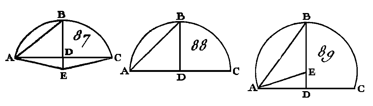Car le segment AEB étant appliqué sur le segment CFD, le point A sur le point C et la droite AB sur la droite CD, le point B s'appliquera sur le point D, puisque la droite AB est égale à la droite CD ; mais la droite AB s'appliquant exactement sur la droite CD, le segment AEB s'appliquera exactement sur le segment CFD ; car si la droite AB s'appliquant exactement sur la droite CD, le segment AEB ne s'applique pas exactement sur le segment CFD, le segment AEB changera de position et prendra par exemple la position CHGD; mais une circonférence de cercle ne peut couper une autre circonférence de cercle en plus de deux points (prop. 10. III), et la circonférence CHGD coupe la circonférence GFD en plus de deux points, savoir, aux points G, G, D, ce qui est impossible; donc la droite AB s'appliquant exactement sur la droite CD, il est impossible que le segment AED ne s'applique pas exactement sur le segment CFD : donc le premier segment s'appliquera exactement sur le second : donc il lui sera égal. Donc, sur des droites égales, les segments de cercles semblables sont égaux entre eux ; ce qu'il fallait démontrer. PROPOSITION XXV.PROBLEME.Un segment de cercle étant donné, décrire le cercle dont il est segment. Soit ABC (fig. 87, 88, 89) le segment de cercle donné : il faut décrire le cercle dont ABC est le segment. Coupez la droite AC en deux parties égales au point D (prop. 10. I), du point D conduisez la perpendiculaire DB sur AC (prop. 11. I), et menez la droite AB ; l'angle ABD est ou plus grand que l'angle BAD, ou il lui est égal, ou il est plus petit.