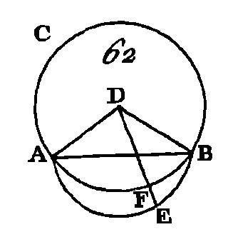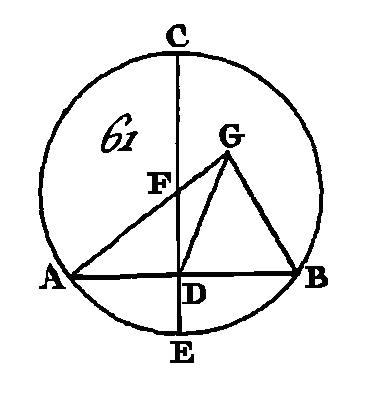 Conduisez dans le cercle une droite quelconque AB, partagez-la en deux parties égales au point D (prop. 10. I) ; du point D élevez une perpendiculaire DC sur AB (prop. 11. I), prolongez la droite DC jusqu'en E, et partagez CE en deux parties égales au point F : je dis que le point F est le centre du cercle ABC. Car supposons que le point F ne le soit pas, et que ce soit le point G, si cela est possible. Conduisez les droites GA, GD, GB. Puisque la droite AD est égale à la droite DB et que la droite DG est commune, les deux droites AD, DG seront égales aux deux droites DB, DG, chacune à chacune ; mais la base GA est égale à la base GB, puisque ce sont deux droites menées du centre à la circonférence (déf. 15. I) : donc l'angle ADG est égal à l'angle GDB (prop. 8. I); mais lorsqu'une droite tombant sur une autre droite fait avec elle les angles de suite égaux, chacun de ces angles égaux est droit (déf.10. I) : donc l'angle GDB est droit; mais l'angle FDB est droit aussi : donc l'angle FDB est égal à l'angle GDB; c'est-à-dire que le plus grand est égal au plus petit, ce qui est impossible : donc le point G n'est pas le centre du cercle ABC. On démontrera de la même manière que tout autre point, excepté le point F, n'est pas le centre du cercle. Donc le point F est le centre du cercle. COROLLAIRE.De là il suit évidemment que si dans un cercle une droite en coupe une autre en deux parties égales en faisant avec elle deux angles droits, le centre du cercle est placé dans la droite sécante. PROPOSITION II.THÉORÈME.Si l'on prend deux points quelconques dans la circonférence d'un cercle, la droite qui joint ces deux points tombera dans le cercle. Soit le cercle ABC (fig. 62) ; qu'on prenne deux points quelconques A, B, dans la circonférence de ce cercle : je dis que la droite qui est menée du point A au point B, tombe dans le cercle.
