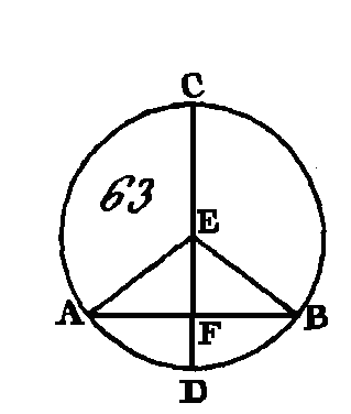 Si cette droite ne tombe pas dans le cercle, supposons, s'il est possible, qu'elle tombe en dehors, en AEB par exemple ; cherchez le centre du cercle ABC (prop. 1. III), supposons que D soit ce centre ; menez les rayons AD, DB, et prolongez DF jusqu'en E. Puisque la droite DA est égale à la droite DB, l'angle DAE sera égal à l'angle DBE (prop. 5. I) ; et puisque l'on a prolongé un côté AEB du triangle DAE, l'angle DEB sera plus grand que l'angle DAE (prop. 16. I) ; mais l'angle DAE est égal à l'angle DBE : donc l'angle DEB est plus grand que l'angle DBE ; mais le plus grand côté est opposé à un plus grand angle (prop. 18. I) : donc la droite DB est plus grande que la droite DE ; mais la droite DF est égale à la droite DB : donc la droite DF est plus grande que la droite DE ; c'est-à-dire que la plus petite surpasse la plus grande, ce qui est impossible : donc la droite menée du point A au point B ne tombe pas hors du cercle. Nous démontrerons de la même manière qu'elle ne tombe pas dans la circonférence : donc elle tombe en-dedans du cercle. Donc si l'on prend deux points quelconques de la circonférence, la droite qui joint ces deux points tombe en-dedans du cercle; ce qu'il fallait démontrer. PROPOSITION III.THÉORÈME.Si dans un cercle une droite qui passe par le centre coupe en deux parties égales une droite qui ne passe pas par le centre, la première droite coupera la seconde à angles droits ; et si la première coupe la seconde à angles droits, elle la coupera en deux parties égales. Soit le cercle ABC (fig. 63) ; supposons que la droite CD menée dans le cercle par le centre coupe la droite AB, qui ne passe pas par le centre, en deux parties égales au point F : je dis que la première droite coupe la seconde à angles droits.