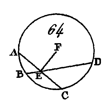 Cherchez le centre du cercle ABC (prop. 1. III); supposons que son centre soit le point E, conduisez les droites EA, EB. Puisque la droite AF est égale à la droite FB et que la droite FE est commune, les deux droites AF, FE sont égales aux deux droites FB, FE ; mais la hase EA est égale à la hase EB : donc l'angle AFE sera égal à l'angle BFE (prop. 8. I); mais lorsqu'une droite tombant sur une autre droite, fait les angles de suite égaux entre eux, chacun de ces angles est droit : donc chacun des angles AFE, BFE est droit: donc la droite CD, menée par le centre et coupant en deux parties égales la droite AB qui ne passe pas par le centre, coupe la droite AB à angles droits. Si la droite CD coupe la droite AB à angles droits, je dis qu'elle la coupe aussi en deux parties égales, c'est-à-dire que la droite AF est égale à la droite FB. Faites la même construction ; puisque la droite EA est égale à la droite EB, l'angle EAF sera égal à l'angle EBF (prop. 5. I) ; mais l'angle droit AFE est égal à l'angle droit BFE : donc les deux triangles EAF, EBF auront deux angles égaux à deux angles, chacun à chacun, et un coté égal à un côté, c'est-à-dire un côté commun qui est opposé à des angles égaux : donc ces deux triangles auront les autres côtés égaux aux autres côtés (prop. 26. I) : donc la droite AF est égale à la droite BF. Donc si dans un cercle une droite qui passe par le centre coupe en deux parties égales une autre droite qui ne passe pas par le centre, la première coupera la seconde à angles droits ; et si la première coupe la seconde à angles droits, elle la coupera en deux parties égales ; ce qu'il fallait démontrer. PROPOSITION IV.THÉORÈME.Si dans un cercle deux droites qui ne passent point par le centre se coupent, elles ne se couperont point en deux parties égales. Soit le cercle ABCD (fig. 64), et supposons que les deux droites AC, BD, qui ne sont point conduites par le centre, se coupent mutuellement au point E : je dis qu'elles ne se coupent point en deux parties égales.
