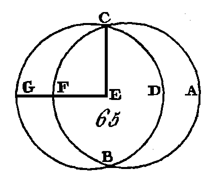 Supposons, s'il est possible, qu'elles se coupent en deux parties égales, de manière que AE soit égal à EC et BE égal à ED : prenez le centre du cercle ABCD, et supposons que son centre soit le point F ; menez FE. Puisque la droite FE conduite par le centre, coupe en deux parties égales la droite AC qui n'est point conduite par le centre, la première coupera la seconde à angles droits (prop. 3. III): donc l'angle FEA est droit. De plus, puisque la droite FE coupe en deux parties égales la droite BD qui n'est pas conduite par le centre, la première coupera la seconde à angles droits, donc l'angle FEB est droit. Mais on a démontré que l'angle FEA est droit aussi : donc l'angle FEA est égal à l'angle FEB; c'est-à-dire que le plus petit est égal au plus grand, ce qui est impossible: donc les droites AC, BD ne se coupent point en deux parties égales. Donc si dans un cercle deux droites qui ne sont point conduites par le centre se coupent mutuellement, elles ne se couperont point en deux parties égales ; ce qu'il fallait démontrer. PROPOSITION V.THÉORÈME.Si deux cercles se coupent mutuellement, ils n’auront pas le même centre. Que les deux cercles ABC, CDG (fig. 65) se coupent mutuellement aux deux points B, G : je dis qu'ils n'auront pas le même centre.