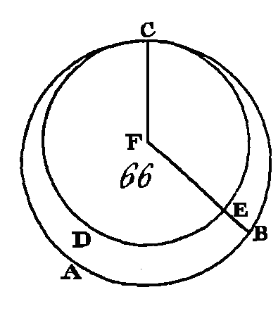 Supposons, s'il est possible, qu'ils aient le même centre et que ce centre soit le point E ; après avoir conduit la droite E C, conduisez la droite EFG d'une manière quelconque. Puisque le point E est le centre du cercle ABC, la droite EC sera égale à la droite EF (déf. 15. I). De plus, puisque le point E est le centre du cercle CDG, la droite EC sera égale à la droite EG. Mais on a démontré que la droite EC est égale à la droite EF : donc la droite EF est égale à la droite EG, c'est-à-dire que la plus petite est égale à la plus grande, ce qui est impossible. Donc le point E n'est pas le centre des cercles ABC, CDG. Donc si deux cercles se coupent mutuellement, ils n'auront pas le même centre ; ce qu'il fallait démontrer. PROPOSITION VI.THÉORÈME.Si deux cercles se touchent intérieurement, ils n'auront pas le même centre. Que les deux cercles ABC, CDE (fig. 66) se touchent intérieurement au point C : je dis qu'ils n'auront pas le même centre.