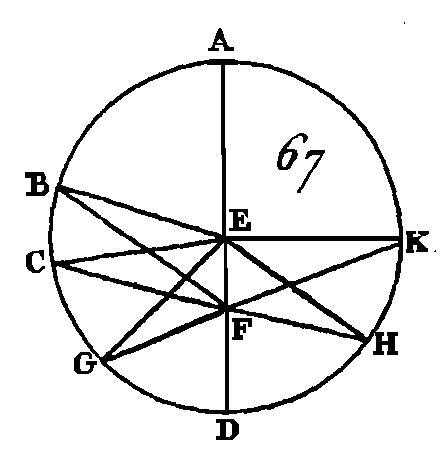 Supposons que cela se puisse et que leur centre soit le point F ; après avoir conduit la droite FC, conduisez d'une manière quelconque la droite FEB. Puisque le point F est le centre du cercle ABC, la droite FC est égale à la droite FB. De plus, puisque le point F est le centre du cercle CDE, la droite FC est égale à la droite FE. Mais on a démontré que la droite FC est égale à la droite FB : donc la droite FE est égale à la droite FB; c'est-à-dire que la plus petite est égale à la plus grande, ce qui est impossible : donc le point F n'est point le centre des cercles ABC, CDE. Donc si deux cercles se touchent intérieurement, ils n'auront pas le même centre ; ce qu'il fallait démontrer. PROPOSITION VII.THÉORÈME.Si dans le diamètre d'un cercle on prend un point quelconque qui ne soit pas. le centre de ce cercle, et si de ce point on conduit des droites à la circonférence, la plus grande sera celle qui passera par le centre, et la plus petite sera le reste du diamètre; quant aux autres droites, celle qui sera plus proche de celle qui passe par le centre sera plus grande que celle qui en est plus éloignée; et enfin du même point on ne peut conduire de part et d'autre de la plus petite que deux droites qui soient égales. Soit le cercle ABCD (fig. 67), que AD soit son diamètre, prenez un point quelconque F qui ne soit pas le centre de ce cercle, que. le centre du cercle soit le point E ; du point F conduisez à la circonférence ABCD les droites FB, FC, FG : je dis que la droite FA est la plus grande, que la droite FD est la plus petite, et que parmi les autres la droite FB est plus grande que la droite FC, et que la droite FC est plus grande que la droite FG. Conduisez les droites BE, CE, GE.