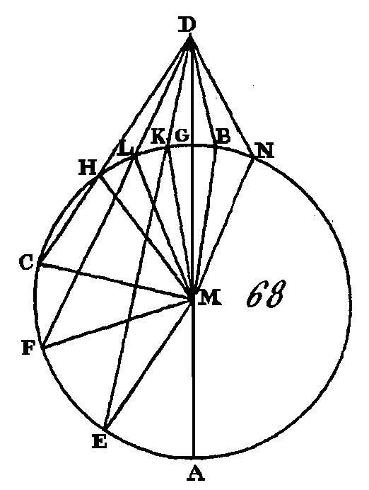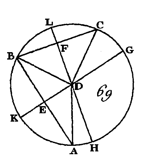 Cherchez le centre du cercle ABC (prop. 1. III), supposons que M soit ce centre; conduisez les droites ME, MF, MC, MR, ML; MH. Puisque la droite A M est égale à la droite EM, si nous leur ajoutons une droite commune MD, la droite AD sera égale aux droites EM, MD; mais les droites EM; MD sont plus grandes que la droite ED (prop. 20. I) : donc la droite AD est plus, grande que la droite ED. De plus, puisque la droite ME est égale à la droite MF, et que la droite MD est commune, les droites EM, MD seront égales aux droites MF, MD; mais l'angle EMD est plus grand que l'angle FMD : donc la base ED sera plus grande que la base FD (prop. 24 I.) Nous démontrerons de la même manière que la droite FD est plus grande que la droite CD : donc la droite DA est la plus grande, la droite DE est plus grande que la droite DF, et la droite DF plus grande que la droite CD. De plus, puisque les droites MK, KD sont plus grandes que la droite MD (prop. 20. I), et que la droite M G est égale à la droite MK, la droite restante KD sera plus grande que la droite restante GD : donc la droite GD est plus petite que la droite KD : donc elle est la plus petite. Si des extrémités du côté MD du triangle MLD on conduit intérieurement les droites MK, KD, les droites MK, KD seront plus petites que les droites ML, LD (prop. 21. I) ; mais la droite MK est égale à la droite ML : donc la droite restante DK est plus petite que la droite restante DL. Nous démontrerons de la même manière que la droite DL est plus petite que la droite DH : donc la droite DG est la plus petite, et la droite DK est plus petite que la droite DL, et la droite DL plus petite que la droite DH. Je dis encore que du point D on ne peut conduire au cercle, de part et d'autre de la plus petite, que deux droites égales. Construisez sur la droite MD, et au point donné M, un angle DMB égal à l'angle KMD, et conduisez DB, Puisque la droite MK est égale à la droite MB et que la droite MD est commune, les deux droites KM, MD sont égales aux deux droites BM, MD, chacune à chacune; mais l'angle KMD est égal à l'angle BMD : donc la base DK est égale à la base DB (prop. 4. I) : je dis qu'il est impossible de conduire du point D au cercle ABC une autre droite qui soit égale à la droite DK. Supposons que cela se puisse et que cette droite soit DN ; puisque la droite DK est égale à la droite DN et la droite DB égale aussi à la droite D K, la droite DB sera égale à la droite DN, c'est-à-dire que la droite qui est plus près de la plus petite est égale à la droite qui s'en éloigne davantage; ce qui a été démontré impossible. AUTREMENT.Conduisez la droite MN; puisque la droite KM est égale à la droite MN, que la droite MD est commune et que la base DK est égale à la base DN, l'angle KMD sera égal à l'angle DMN (prop. 8. I); mais l'angle KMD est égal à l'angle BMD : donc l'angle BMD est égal à l'angle NMD, c'est-à-dire que le plus petit est égal au plus grand, ce qui est impossible : donc il est impossible de conduire du point D au cercle ABC, et de part et d'autre de la plus petite droite GD, plus de deux droites égales. Donc si l'on prend un point quelconque hors d'un cercle, et si de ce point on conduit à ce cercle plusieurs droites dont l'une passe par le centre et dont les autres passent partout où l'on voudra ; parmi les droites qui vont à la circonférence concave, la plus grande est celle qui passe par le centre ; celle qui est plus près de celle qui passe par le centre est plus grande que celle qui s'en éloigne davantage ; mais parmi les droites qui vont à la circonférence convexe, la plus petite est celle qui est comprise entre le point pris hors du cercle et le diamètre ; et celle qui est plus près de la plus petite est plus courte que celle qui s'en éloigne davantage ; enfin de ce point on ne peut mener à la circonférence, et de part et d'autre de la plus petite, que deux droites qui soient égales ; ce qu'il fallait démontrer. PROPOSITION IX.THÉORÈME.Si dans un cercle l'on prend un point quelconque, et si parmi les droites menées de ce point à la circonférence il y en a plus de deux qui soient égales entre elles, ce point sera le centre du cercle. Soit le cercle ABC (fig. 69), que dans ce cercle l'on prenne le point D et qu'il y ait plus de deux droites égales entre elles qui aillent, de ce point à la circonférence, c'est-à-dire les droites DA, DB, DC: je dis que le point D est le centre du cercle ABC. Conduisez les droites AB, BC, et partagez-les en deux parties égales aux points E, F (prop. 10. I), conduisez les droites ED, DF, que vous prolongerez vers les points G, K, H, L.