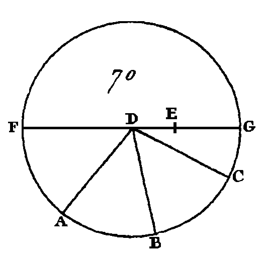 Puisque la droite AE est égale à la droite EB, et que la droite ED est commune, les deux droites AE, ED seront égales aux deux droites BE, ED ; mais la base DA est égale à la base DB : donc l'angle AED est égal à l’angle BED (prop. 8. I), et par conséquent chacun des angles AED, BED est droit : donc la droite GR, qui coupe la droite AB en deux parties égales, la coupe aussi à angles droits ; mais lorsque dans un cercle une droite coupe une autre droite en deux parties égales et à angles droits, le centre du cercle est placé dans la droite sécante (cor. 1. III) : donc le centre du cercle ABC sera dans la droite GK ; par la même raison le centre du cercle ABC sera placé dans la droite HL ; mais les droites GK, HL n'ont qu'un seul point commun qui est le point D : donc le point D est le centre du cercle ABC. Donc si dans un cercle on prend un point quelconque, et si parmi les droites menées de ce point à la circonférence il y en a plus de deux qui soient égales entre elles, ce point sera le centre du cercle. AUTREMENT.Dans le cercle ABC (fig. 70) soit pris un point quelconque D, et que parmi les droites menées du point D à la circonférence ABC il y en ait plus de deux qui soient égales entre elles, c'est-à-dire les droites DA, DB, DC : je dis que le point D est le centre du cercle ABC. Supposons, s'il est possible, que le point D ne soit pas le centre du cercle ABC, et supposons que le centre de ce cercle soit le point E, conduisez la-droite DE et prolongez-la vers F, G.