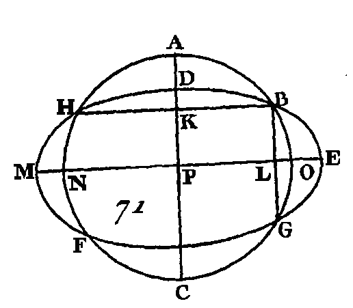 La droite FG sera un diamètre du cercle ABC. Si l'on prend dans le diamètre FG du cercle ABC un point D qui ne soit pas le centre de ce cercle, la droite DG sera la plus grande de toutes, et la droite DC sera plus grande que la droite DB, et la droite DB plus grande que la droite DA (prop. 7. III) ; mais ces droites sont égales, ce qui ne peut être : donc le point E n'est pas le centre du cercle ABC. Nous démontrerons de la même manière qu'il n'y a pas d'autre point, excepté le point D, qui soit le centre du cercle ADC : donc le point D est le centre du cercle ABC. PROPOSITION X.THÉORÈME.Une circonférence de cercle ne peut couper la circonférence d'un autre cercle qu'en deux points. Supposons que cela puisse arriver, et que la circonférence du cercle ABC (fig. 71) coupe la circonférence du cercle DEF en plus de deux points : savoir, aux points B, G, H; conduisez les droites BG, BH, et partagez-les en deux parties égales aux points K, L; par les points K, L, conduisez les droites KC, LM perpendiculaires sur BG, BH, et prolongez-les vers les points A, E.
