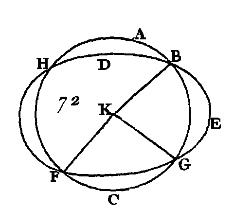Puisque dans le cercle ABC, la droite AC coupe la droite BH en deux parties égales et à angles droits, le centre du cercle ABC sera placé dans la droite AC (corol. 1. III). De plus, puisque dans le même cercle ABC la-droite NO coupe la droite BG en deux parties égales et à angles droits le centre du cercle ABC sera placé dans la droite NO. On à démontré que le centre est placé dans la droite AC, et les deux droites AC, MO ne se rencontrent qu'au seul point O : donc le point O est le centre du cercle ABC. Nous démontrerons de la même manière que le point O est le centre du cercle DEF : donc les deux cercles ABC, DEF, qui se coupent mutuellement, auront le même centre O; ce qui est impossible (prop. 5. III). Donc la circonférence d'un cercle ne peut pas couper la circonférence d'un autre cercle en plus de deux points ; ce qu'il fallait démontrer. AUTREMENT.Car que la circonférence du cercle ABC (fig. 72) coupe la circonférence du cercle DEF en plus de deux points, savoir, aux points B, G, F ; prenez le centre du cercle ABC, et que son centre soit le point K; menez les droites KF, KG, KB.