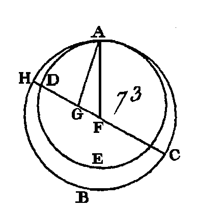 Puisque dans le cercle DEF on a pris un point K, et que parmi les droites qui vont de ce point à la circonférence DEF il y en a plus de deux qui sont égales entre elles, savoir, les droites KB, KF, KG, le point K sera le centre du cercle DEF (prop. 9. III); mais le point K est le centre du cercle ABC : donc ces deux circonférences, qui se coupent, auront le même centre ; ce qui est impossible (prop. 5. III). Donc une circonférence de cercle ne peut pas couper la circonférence d'un autre cercle en plus de deux points ; ce qu'il fallait démontrer. PROPOSITION XI.THÉORÈME.Si deux circonférences de cercle se touchent intérieurement, et si on prend leurs centres, la droite qui joindra leurs centres ira au point de contact si elle est prolongée. Que les deux cercles ABC, ADE (fig. 73) se touchent intérieurement au point A ; qu'on prenne leurs centres, que le point F soit le centre du cercle ABC, et que le point G soit le centre du cercle ADE : je dis que la droite menée du point G au point F ira au point de contact A, si elle est prolongée.