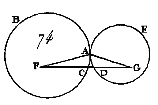 Supposons, s'il est possible, que cette droite étant prolongée n'aille pas au point de contact et qu'elle ait la position FGDH; menez les droites AF, AG. Puisque les droites AG, GF sont plus grandes que la droite FA (prop. 20. I), c'est-à-dire que la droite FH, car la droite FA est égale à la droite FB, puisqu'elles partent du même centré: donc si on ôte la droite commune FG, la droite AG sera plus grande que la droite GH ; mais la droite AG est égale à la droite GD : donc la droite GD est plus grande que la droite GH ; c'est-à-dire que la plus petite surpasse la plus grande ; ce qui est impossible : donc la droite menée du point F au point G ne peut pas passer autre part qu'au point de contact A : donc elle passe au point de contact. Donc si deux cercles se touchent intérieurement, la droite qui joint leurs centres passera par le point de contact, si elle est prolongée ; ce qu'il fallait démontrer. AUTREMENT.Supposons que la droite menée du point G au point F ait la position GFC et qu'elle soit prolongée directement vers le point H, menez les droites AG, AF. Puisque les droites AG, GF sont plus grandes que la droite AF, et que la droite AF est égale à la droite CF, ou bien à la droite FH, si l'on retranche la droite commune FG, la droite restante AG sera plus grande que la droite restante GH, mais AG est égal à GD : donc la droite GD est plus grande que la droite GH, c'est-à-dire que la plus petite surpasse la plus grande; ce qui est impossible. Si le centre du grand cercle est hors du petit cercle, nous démontrerons de même qu'il s'en suit une absurdité. PROPOSITION XII.THÉORÈME.Si deux circonférences de cercle se touchent extérieurement, la droite qui joindra les deux centres passera par le point de contact. Que les circonférences des deux cercles ABC, ADE (fig. 74) se touchent extérieurement au point A ; qu'on prenne leurs centres, que le centre du cercle ABC soit le point F, et que le centre du cercle ADE soit le point G : je dis que la droite qui est conduite du point F au point G passe par le point de contact.