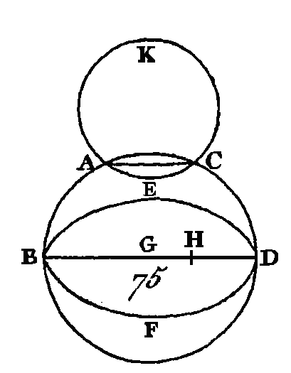 Cherchez les centres des cercles ABDC, EBFD ; que le point G soit le centre du premier et le point H le centre du second. La droite qui est conduite du point G au point H passera par les points B, D (prop. 11. III). Qu'elle ait la position BGHD ; puisque le point G est le centre du cercle ABDC, la droite BG est égale à la droite GD : donc la droite BG est plus grande que la droite HD, et la droite BH beaucoup plus grande que la droite HD. De plus, puisque le point H est le centre du cercle EBFD, la droite BH est égale à la droite HD; mais on a démontré qu'elle est beaucoup plus grande, ce qui est impossible : donc une circonférence de cercle ne touche point intérieurement une autre circonférence de cercle en plus d'un point. Je dis encore qu'il est impossible qu'une circonférence de cercle touche extérieurement une autre circonférence de cercle en plus d'un point ; car si cela était possible, il faudrait que la circonférence du cercle ACK touchât extérieurement la circonférence du cercle ABDC en plus d'un point, aux points A, C, par exemple ; conduisez la droite AG. Puisque dans la circonférence des cercles ABDC, ACK on a pris deux points quelconques A, C, la droite qui joint ces deux points tombera intérieurement dans l'une et l'autre des deux circonférences (prop. 2. III); mais la droite qui tombe dans le cercle ABDC tombera hors du cercle ACK (déf. 3. III), ce qui est absurde : donc une circonférence de cercle ne touche point extérieurement une autre circonférence de cercle en plus d'un point. On a démontré qu'une circonférence ne touche point intérieurement une autre circonférence en plus de deux points. Donc une circonférence de cercle ne touche point une autre circonférence de cercle en plus d'un point, soit qu'elle la touche intérieurement, soit qu'elle la touche extérieurement; ce qu'il fallait démontrer. PROPOSITION XIV.THÉORÈME.Dans un cercle les droites égales sont également éloignées du centre, et celles qui sont également éloignées du centre sont égales. Soit le cercle ABDC (fig. 76) et que les droites AB, CD, prises dans sa circonférence, soient égales : je dis que ces deux droites sont également éloignées du centre.