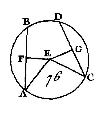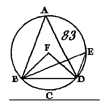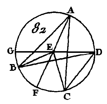 Puisque la droite EA est égale à la droite EB, l’angle EAB sera égal à l’angle EBA (prop. 5. I) ; donc les angles EAB, EBA sont doubles de l'angle EAB ; mais l'angle BEF est égal aux angles EAB, EBA (prop. 32. I); donc l'angle BEF est double de l'angle EAB. L'angle FEC est double de l'angle FAC par la même raison; donc l'angle total BEC est double de l'angle total BAC. Que l'angle BAC change de position et qu'il devienne BDC ; conduisez la droite DE et prolongez-la jusqu'en G. Nous démontrerons semblablement que l'angle GEC est double de l'angle GDG ; mais l'angle GEB est double de l'angle GDB : donc l'angle restant BEC est double de l'angle restant BDC. Donc dans le cercle, l'angle au centre est double de l'angle à la circonférence, quand ils ont pour base la même portion de la circonférence ; ce qu'il fallait démontrer. PROPOSITION XXI.THÉORÈME.Les angles placés dans un même segment de cercle sont égaux entre eux. Soit le cercle ABCD (fig. 83) et que les angles BAD, BED soient placés dans le même segment BAED : je dis que ces angles sont égaux entre eux.