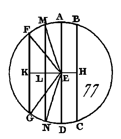 Cherchez le centre du cercle ABDC, et que ce centre soit le point E ; de ce point conduisez les droites EF, E G perpendiculaires sur les droites AB, CD, et menez les droites AE, EC. Puisque la droite EF, menée par le centre, coupe à angles droits la droite AB, qui n'est pas menée par le centre, elle la coupe en deux parties égales (prop. 3. III) : donc la droite AF est égale à la droite FB, et par conséquent la droite AB est double de la droite AF. Par la même raison la droite CD est double de la droite CG; mais la droite AB est égale à la droite CD : donc la droite AF est égale à la droite CG : et puisque la droite AE est égale à la droite EC, le carré de la droite AE est égal au carré de la droite EC ; mais les carrés des droites AF, FE sont égaux au carré de la droite AE (prop. 47. I) car l'angle AFE est droit; et les carrés des droites EG, GC sont égaux au carré de la droite EC, puisque l'angle CGE est droit : donc les carrés des droites AF, FE sont égaux aux carrés des droites CG, GE; mais le carré de la droite AF est égal au carré de la droite CG, puisque la droite AF est égale à la droite CG : donc le carré restant de la droite FE est égal au carré restant de la droite EG : donc la droite FE est égale à la droite EG ; mais dans un cercle les droites sont dites également éloignées du centre lorsque les perpendiculaires menées du centre sur ces lignes sont égales (déf. 4. III) : donc les droites AB, CD sont également éloignées du centre. Supposons actuellement que les droites AB, CD soient également éloignées du centre ; c'est-à-dire, supposons que la droite FE soit égale à la droite EG : je dis que la droite AB est égale à la droite CD. Avec les mêmes constructions nous démontrerons également que la droite AB est double de la droite AF, et que la droite CD est double aussi de la droite CG. Puisque la droite AE est égale à la droite EC, le carré de la droite AE sera égal au carré de la droite EC ; mais les carrés des droites EF, FA sont égaux au carré de la droite de AE (prop. 47. I), et les carrés des droites EG, GC égaux au carré de la droite EC : donc les carrés des droites EF, FA sont égaux aux carrés des droites EG, GC ; mais le carré de la droite EG est égal au carré de la droite EF, car la droite EG est égale à la droite EF : donc le carré restant de la droite AF est égal au carré restant de la droite CG : donc la droite AF est égale à la droite CG ; mais la droite AB est double de la droite AF, et la droite CD double de la droite CG : donc la droite AB sera égale à la droite CD. Donc dans une circonférence de cercle les droites égales sont également distantes du centre, et les droites également distantes du centre sont égales ; ce qu'il fallait démontrer. PROPOSITION XV.THÉORÈME.Dans une circonférence de cercle le diamètre est la plus grande de toutes les droites, et la droite qui est plus près du centre est plus grande que celle qui en est plus éloignée. Soit le cercle ABCD (fig. 77) dont le diamètre est la droite AD et dont le centre est le point E ; que la droite BC soit plus près du centre E que la droite FG : je dis que la droite AD est la plus grande de toutes, et que la droite BC est plus grande que la droite FG. Conduisez du centre les droites EH, EK perpendiculaires sur BC, FG. Puisque la droite BC est plus près du centre que la droite FG, la droite EK sera plus grande que la droite EH (déf. 5. III); faites la droite EL égale à la droite EH, et par le point L conduisez la droite LM perpendiculaire sur EK, prolongez la droite LM vers le point N, et menez les droites EM, EN, EF, EG.