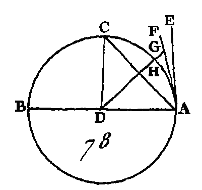Puisque la droite EL est égale à la droite EH, la droite MN sera égale à la droite BC (prop. 14. III). De plus, puisque la droite AE est égale à la droite EM et la droite ED égale à la droite EN, la droite AD sera égale aux droites ME, EN; mais les droites ME, EN sont plus grandes que la droite MN : donc la droite AD est plus grande que la droite MN ; mais la droite MN est égale à la droite BC: donc la droite AD est plus grande que la droite BC; et puisque les deux droites ME, EN sont égales aux deux droites FE, EG, et que l'angle MEN est plus grand que l'angle FEG, la base MN sera plus grande que la base FG (prop. 24. I) Mais on a démontré que la droite MN est égale à la droite BC : donc la droite BC est plus grande que la droite FG : donc le diamètre AD est la plus grande de toutes les droites, et la droite BC est plus grande que la droite FG. Donc dans une circonférence de cercle le diamètre est la plus grande de toutes les droites, et la droite qui est plus près du centre est plus grande que celle qui en est plus éloignée ; ce qu'il fallait démontrer. PROPOSITION XVI.THÉORÈME.Une droite perpendiculaire sur le diamètre d'un cercle et menée par une de ses extrémités, tombe hors de ce cercle; il est impossible qu'il y ait une droite dans l'espace qui est compris entre cette perpendiculaire et la circonférence ; l'angle du demi-cercle est plus grand qu'aucun angle rectiligne aigu, et l'autre angle est plus petit qu'aucun angle rectiligne aigu. Soit le cercle ABC (fig. 78) dont le point D est le centre et la droite AB le diamètre : je dis que la perpendiculaire sur la droite AB, menée par le point A, tombe hors du cercle. Car si cela n'est point, supposons s'il est possible, qu'elle tombe en-dedans et qu'elle ait la position AC ; conduisez la droite DC. Puisque la droite DA est égale à la droite DC, l'angle DAC sera égal à l'angle ACD (prop. 5. I) ; mais l'angle DAC est droit : donc l'angle ACD est droit aussi : donc les angles DAC, ACD sont égaux à deux angles droits, ce qui est impossible (prop. 17. I) : donc la perpendiculaire au diamètre AB, menée par le point A ne tombe point dans le cercle. Nous démontrerons de la même manière qu'elle ne tombe point sur la circonférence : donc il est nécessaire qu'elle tombe en dehors, et qu'elle ait la même position que la droite AE. Je dis qu'il est impossible qu'il y ait une droite dans l'espace qui est compris entre la droite AE et la circonférence CHA. Car si cela est possible, supposons qu'il y ait une droite qui ait la position FA ; du point D menez une droite DG perpendiculaire à FA.