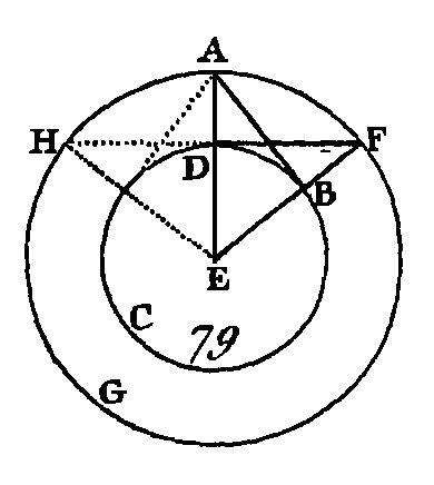 Puisque l'angle AGD est droit et que l'angle DAG est plus petit qu'un angle droit, la droite AI sera plus grande que la droite DG; mais la droite DA est égale à la droite DH : donc la droite DH est plus grande que la droite AG, c'est-à-dire que la plus petite surpasse la plus grande, ce qui est impossible : donc il est impossible qu'il y ait une droite dans l'espace qui est compris entre cette perpendiculaire et la circonférence. Je dis de plus, que l'angle du demi-cercle qui est compris par la droite BA et la circonférence CHA est plus grand qu'aucun angle rectiligne aigu, et que l’angle restant compris par la circonférence CHA et la droite AE est plus petit qu'aucun angle rectiligne aigu. Car s'il y a un angle rectiligne plus grand que l'angle compris par la droite BA et par la circonférence CHA, pu s'il y a un angle rectiligne plus petit que l'angle compris par la circonférence CHA et par la droite AE, supposons que dans l'espace compris entre la circonférence CHA et la droite AE, il y ait une droite quelconque qui fasse un angle plus grand que celui qui est compris par la droite BA et la circonférence CHA, savoir, un angle compris par deux droites, et qu'il y ait un angle plus petit que celui qui est compris par la circonférence CHA et la droite AE ; mais il n'y en a point : donc il n'y a point d'angle aigu qui, étant compris par des droites, soit plus grand que l'angle compris par la droite BA et la circonférence CHA, ni d'angle plus petit que celui qui est compris par la circonférence CHA et la droite AE ; ce qu'il fallait démontrer. COROLLAIRE.Il suit manifestement de là que la droite perpendiculaire au diamètre, et menée d'une de ses extrémités, touche la circonférence, et que cette droite ne la touche qu'en un seul point, parce que nous avons démontré que les droites que rencontre le cercle en deux points, entrent dans le cercle (prop. 2. III). PROPOSITION XVII.PROBLEME. D'un point donné, conduire une droite qui touche la circonférence d'un cercle donné. Soit A (fig. 79) un point donné quelconque et BCD le cercle donné, il faut conduire, du point À une droite qui touche la circonférence du cercle BCD. Prenez le centre de ce cercle, conduisez la droite AE; du centre E et avec un intervalle EA, décrivez la circonférence AFG (dem. 3) ; par le point D conduisez une perpendiculaire DP sur la droite EA et menez les droites EBF, AB : je dis que la droite AB menée du point A, touche la circonférence du cercle BCD.