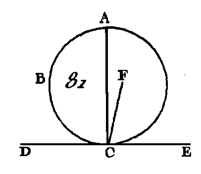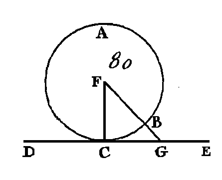 Puisque le point E est le centre des cercles BCD, AFG, la droite EA sera égale à la droite EF, et la droite ED égale à la droite EB : donc les deux droites AE, EB sont égales aux deux droites FE, ED; mais ces droites comprennent un angle commun qui est en E : donc la base DF est égale à la base AB, le triangle DEF au triangle EBA, et les autres angles de l'un de ces triangles sont égaux aux autres angles de l'autre triangle (prop. 4. I) donc l'angle EBA est égal à l'angle EDF ; mais l'angle EDF est droit : donc l'angle EBA est droit aussi. Mais la droite EB est un rayon et la perpendiculaire à une des extrémités d'un diamètre touche le cercle (prop. 16. III) : donc la droite AB touche le cercle. Donc la droite AB, qui a été menée par le point A, touche le cercle BCD ; ce qu'il fallait faire. PROPOSITION XVIII.THÉORÈME.Si une droite touche la circonférence d'un cercle i et si du centre on mène une droite au point de contact, cette dernière droite sera perpendiculaire sur la première. Que la droite DE (fig. 80) touche au point C la circonférence du cercle ABC; prenez le centre F de ce cercle, et de ce centre conduisez la droite FG au point C : je dis que la droite FC est perpendiculaire sur la droite DE.