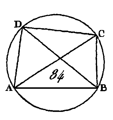 Prenons le centre du cercle ABCD (prop. 1. III), et que ce centre soit le point F ; menez les droites BF, FD. Puisque l'angle BFD est au centre, que l'angle BAD est à la circonférence, et que ces deux angles ont pour base la même portion de la circonférence, l'angle BFD sera double de l’angle BAD (prop. 20. III) ; l'angle BFD est double aussi de l'angle BED, par la même raison : donc l'angle BAD est égal à l’angle BED (ax. 7). Donc les angles, placés dans le même segment de cercle, sont égaux entre eux ; ce qu'il fallait démontrer. PROPOSITION XXII.THÉORÈME.Les angles opposés des quadrilatères inscrits dans des cercles sont égaux à deux droits. Soit le cercle ABCD (fig. 84) et que le quadrilatère ABCD soit inscrit dans ce cercle : je dis que les angles opposés de ce quadrilatère sont égaux à deux droits. Conduisez les droites AC, BD.