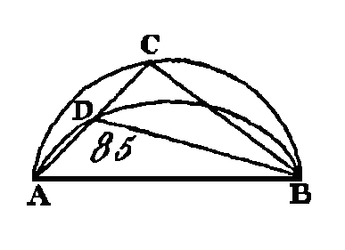 Puisque les trois angles de tout triangle sont égaux à deux droits (prop. 32. I), les trois angles CAB, ABC, BCA du triangle ABC seront égaux à deux angles droits; mais l'angle CAB est égal à l'angle BDC (prop. 21. III), car ces deux angles sont placés dans le même segment BADC ; l’angle ACB est égal à l'angle ADB, parce que ces deux angles sont placés dans le même segment ; donc l'angle total ADC est égal aux angles BAC, ACB ; donc si nous ajoutons un angle commun ABC, les angles ABC, BAC, ACB seront égaux aux angles ABC, ADC; mais les angles ABC, BAC, ACB sont égaux à deux droits : donc les angles ABC, ADC sont égaux à deux angles droits. Nous démontrerons semblablement que les angles BAD, DCB sont aussi égaux à deux droits. Donc les angles opposés des quadrilatères inscrits dans des cercles sont égaux à deux droits ; ce qu'il fallait démontrer. PROPOSITION XXIII.THÉORÈME.Sur une même droite, on ne peut pas décrire du même côté deux segments de cercles semblables et inégaux. Supposons que cela soit possible ; décrivez du même côté et sur la même droite AB (fig. 85) deux segments de cercle ACB, ADB semblables et inégaux, et conduisez la droite ADC et les droites CB, DB.