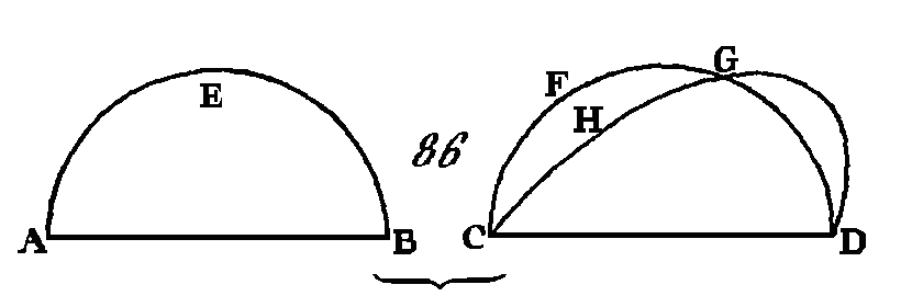 Puisque le segment ACB est semblable au segment ADB, et que les segments de cercles semblables sont ceux qui reçoivent des angles égaux (déf. 11. III), l'angle ACB sera égal à l'angle ADB, c'est-à-dire qu'un angle intérieur est égal à un angle extérieur ; ce qui est impossible (prop. 16. I). Donc sur une même droite on ne peut pas décrire du même côté deux segments de cercles semblables et inégaux ; ce qu'il fallait démontrer. PROPOSITION XXIV.THÉORÈME.Sur des droites égales, les segments de cercles semblables sont égaux entre eux. Que sur les droites égales AB, CD (fig. 86) soient décrits les segments de cercles semblables AEB, CFD : je dis que le segment AEB est égal au segment CFD.