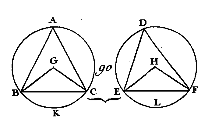 Supposons d'abord qu’il soit plus grand; sur la droite donnée BA; (fig. 87) et au, point donné A faites l'angle BAE égal à l'angle ABD (prop. 23. I), prolongez la droite, DB jusqu'en. E, et conduisez la droite EC. Puisque l'angle ABE est égal à l'angle BAE, la droite BE sera égale à la droite EA (prop. 6. I), et puisque la droite AD est égale à la droite DC et que la droite DE est commune, les deux droites AD, DE sont égales aux deux droites CD, DE, chacune à chacune ; mais l'angle ADE est égal à l'angle CDE, car ils sont droits l'un et l'autre ; donc la base AE est égale à la base EC (prop. 4. I) a s’il a été démontré que la droite AE est égale à la droite EB : donc la droite BE est égale à la droite EC : donc les trois droites AE, EB, EC sont égales entre elles : donc la circonférence de cercle décrite du point E comme, centre, et avec un intervalle égal à l'une des droites AE, EB, EC, passera par les autres points, et le cercle sera décrit : donc un segment de cercle ayant été donné, on a décrit le cercle dont il est segment (prop. 9. III). Il est évident que le segment ABC est plus petit qu'un demi-cercle, puisque le centre E est placé en-dehors de ce segment. Si l'angle ABD (fig. 88) est égal à l'angle BAD, la droite AD étant égale à chacune des droites BD, DC, les trois droites DA, DB, DC seront égales entre elles ; le point. D sera le centre du cercle entier (prop. 9. III), et le segment ABC sera un demi-cercle. Mais si l'angle ABD (fig. 89) est moindre que l'angle BAD, et si sur la droite BA et au point A donné dans cette droite, on fait l'angle BAE égal à l'angle ABD, le centre E sera en-dedans du segment ABC et sur la droite DB, et le segment sera plus grand qu'un demi-cercle. Donc étant donné un segment de cercle, on a décrit le cercle dont il est segment ; ce qu'il fallait faire. PROPOSITION XXVI.THÉORÈME.Dans des cercles égaux des angles égaux s'appuient sur des arcs égaux, soit qu'ils soient placés tous deux au centre ou tous deux à la circonférence. Soient ABC, DEF (fig. 90) des cercles égaux, qu'aux centres de ces cercles soient les angles égaux BGC, EHF, et qu'à leurs circonférences soient les angles égaux BAC, EDF je dis que l'arc BKC est égal à l'arc ELF. Conduisez les droites BC, EF.
