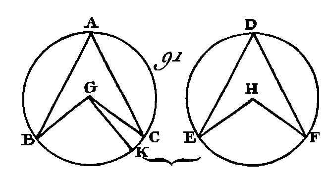 Puisque les cercles ABC, DEF sont égaux, leurs rayons seront égaux : donc les deux droites BG, GC sont égales aux deux droites EH, HF ; mais les angles G, H sont égaux : donc la base BC est égale à la base EF (prop. 4. I). Puisque l'angle A est égal à l'angle D, le segment BAC sera semblable au segment EDF (déf. 11. III) ; mais ces segments sont placés sur les droites égales BC, EF, et les segments semblables, qui sont placés sur des droites égales, sont égaux entre eux (prop. 24. III) : donc le segment BAC est égal au segment EDF ; mais le cercle entier ABC est égal au cercle entier DEF : donc le segment restant BKC est égal au segment restant ELF : donc l'arc BKC sera égal à l'arc ELF. Donc, dans les cercles égaux, des angles égaux s'appuient sur des arcs égaux, soit qu'ils soient placés tous deux au centre ou tous deux à la circonférence ; ce qu'il fallait démontrer. PROPOSITION XXVII.THÉORÈME.Dans les cercles égaux, les angles qui s'appuient sur des arcs égaux sont égaux entre eux, soit qu'ils soient placés tous deux au centre ou tous deux à la circonférence. Que dans les cercles égaux ABC, DEF (fig. 91) les angles au centre BGC, EHF, et les angles à la circonférence BAC, EDF s'appuient sur les arcs égaux BC, EF : je dis que l'angle BGG est égal à l'angle EHF, et l'angle BAC égal à l'angle EDF.