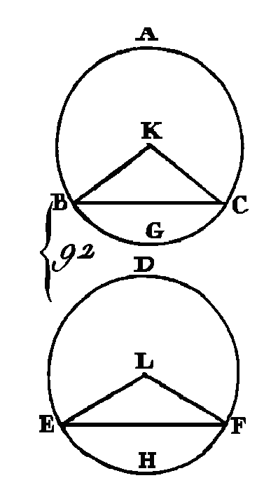 Prenez les centres E, L de ces cercles (prop. 1. III), et menez les droites BK, KC, EL, LF. Puisque ces cercles sont égaux leurs rayons seront égaux : donc les deux droites BK, KC sont égales aux deux droites EL, LF ; mais la base BC est égale à la base EF : donc l'angle BKC est égal à l'angle ELF (prop. 8. I) ; or les angles égaux s'appuient sur des arcs égaux quand ils sont placés aux centres (prop. 26. III) ; donc l'arc BGC est égal à l'arc EHF ; mais la circonférence entière ABC est égale à la circonférence entière DEF : donc l'arc restant ABC est égal à l'arc restant EDF. Donc, dans des cercles égaux, des cordes égales sous-tendent des arcs égaux, le plus grand arc étant égal au plus grand, et le plus petit égal au plus petit ; ce qu'il fallait démontrer. PROPOSITION XXIX.THÉORÈME.Dans des cercles, égaux des cordes égales sous-tendent des, arcs égaux. Soient, les cercles égaux ABC, DEF (fig. 92) ; que dans ces cercles soient pris les arcs égaux BGC, EHF, et menez les cordes BG, EF : je dis que la corde BC est égale à la corde EF.