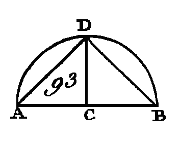 Prenez les centres K, L de ces cercles, et menez les droites BK KC, EL, LF. Puisque l'arc BGC est égal à l'arc EHF, l'angle BKC est égal à l'angle ELF (prop. 27. III); et puisque les cercles ABC, DEF sont égaux, leurs rayons seront égaux : donc les deux droites BK, KC sont égales aux deux droites EL, LF ; mais ces droites comprennent des angles égaux : donc la base BC est égale à la base EF (prop. 4. I) Donc, dans des cercles égaux, des cordes égales sous-tendent des arcs égaux ; ce qu'il fallait démontrer. PROPOSITION XXX.PROBLÈME.Partager un arc donné en deux parties, égales. Soit ADB (fig. 93) un arc donné : il faut partager l'arc ADB en deux parties. Menez la corde AB, et partagez-la en deux parties égales en C (prop. 10. I) ; du point C élevez une perpendiculaire CD sur la corde AB (prop. 11. I), et menez les droites AD, DB.