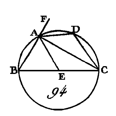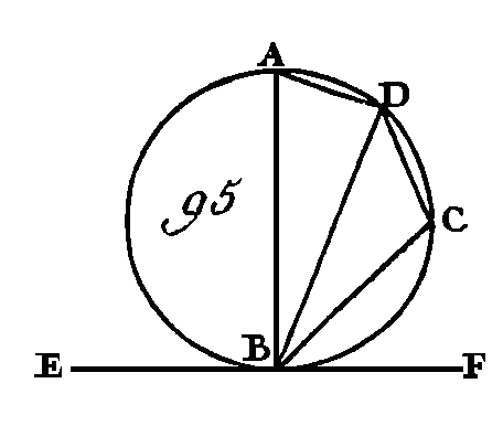 Conduisez la droite AE, et prolongez BA vers F. Puisque la droite BE est égale à la droite E A, l'angle EAB sera égal à l'angle EBA (prop. 5. I). De plus, puisque la droite EA est égale à la droite EC, l'angle ACE sera égal à l'angle CAE : donc l'angle total BAC est égal aux deux angles ABC, ACB; mais l'angle extérieur FAC du triangle ABC est égal aux deux angles ABC, ACB (prop. 32. I) : donc l'angle BAC est égal à l'angle FAC : donc chacun de ces angles est droit (prop. 10. I) : donc l'angle BAC, compris dans le demi-cercle BAC, est droit. Puisque les deux angles AB C, B AC du triangle ÀBC sont plus petits que deux droits (prop. 17. I), et que l'angle BAC est droit, l'angle ABC sera plus petit qu'un angle droit, et cet angle est compris dans le segment ABC plus grand qu'un demi-cercle. Puisque le quadrilatère ABCD est placé dans un cercle et que les angles opposés des quadrilatères décrits dans des cercles sont égaux à deux angles droits (prop. 22. III), les angles ABC, ADC sont égaux à deux angles droits ; mais l'angle ABC est plus petit qu'un angle droit : donc l'angle restant ADC est plus grand qu'un angle droit, et cet angle est compris dans le segment ADC plus petit qu'un demi-cercle. Je dis en outre que l'angle d'un plus grand segment, compris par l'arc ABC et la droite AC, est plus grand qu'un angle droit, et que l'angle d'un segment moindre, compris, par l'arc ADC et la droite AC, est moindre qu'un angle droit, et cela est certainement évident ; car puisque l'angle compris par les droites BA, AC est droit, l'angle compris par l'arc ABC et la droite AC sera plus grand qu'un angle droit. De plus, puisque l'angle compris par les droites CA, AF est droit, l'angle compris par la droite CA et l'arc ADC sera plus petit qu'un angle droit. Donc, dans un cercle, l'angle compris dans un demi-cercle est droit ; celui qui est compris dans un plus grand segment est plus petit qu'un angle droit, et celui qui est compris dans un segment plus petit est plus grand qu'un angle droit. De plus, l'angle d'un plus grand segment est plus grand qu'un angle droit, et l'angle d'un segment moindre est plus petit ; ce qu'il fallait démontrer. AUTREMENT.L'angle BAC est droit, puisque l'angle AEC est double de l'angle BAE, car il est égal aux deux angles intérieurs et opposés (prop. 32. I) ; mais l'angle AEB est double de l'angle EAC : donc les angles AEB, AEC seront doubles de l'angle BAC ; mais les angles AEB, AEC sont égaux à deux angles droits (prop. 13. I) : donc l'angle ABC est droit ; ce qu'il fallait démontrer. COROLLAIRE.De là il suit manifestement que si l'un des angles d'un triangle est égal aux deux autres, cet angle sera droit, parce que son angle de suite est égal aux deux autres ; or quand deux angles de suite sont égaux, ces deux angles sont droits l'un et l'autre (déf. 10. I). PROPOSITION XXXII.THÉORÈME.Si une droite touche la circonférence d'un cercle, et si du point de contact on conduit une corde, les angles que cette corde fait avec la tangente seront égaux aux angles qui sont placés dans les segments alternes du cercle. Que la droite EF (fig. 95) touche la circonférence du cercle ABCD au point B, et que du point B soit conduite la corde BD d'une manière quelconque : je dis que les angles que la corde BD fait avec la tangente EF sont égaux à ceux qui sont compris dans les segments alternes du cercle ; c'est-à-dire que l'angle FBD est égal à l'angle compris dans le segment DAB, et que l'angle EBD est égal à l'angle qui est compris dans le segment DCB.