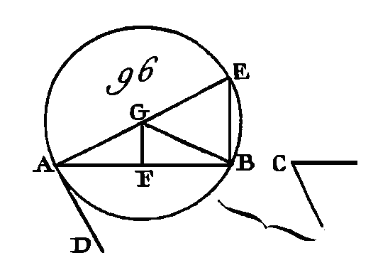 Supposons d'abord que cet angle soit aigu, comme dans la figure 96; sur la droite AB et au point A construisez un angle BAD égal à l'angle C (prop. 23. I) ; l'angle BAD sera aigu. Du point A conduisez la droite AE perpendiculaire sur la droite AD (prop. 11. I) ; partagez AB en deux parties égales au point F (prop. 10. I) y et du point F conduisez la droite FG perpendiculaire sur la droite AB, et menez la droite GB. Puisque la droite AF est égale à la droite FB et que la droite FG est commune, les deux droites AF, FG sont égales aux deux droites FB, FG ; mais l'angle AFG est égal à l'angle GFB : donc la base AG est égale à la base GB (prop. 4. I) : donc la circonférence décrite du centre G et avec l'intervalle AG passera par le point B. Décrivez cette circonférence et qu'elle soit ABE, et menez la droite EB. Puisque du point A, extrémité du diamètre AE, on à conduit sur la droite AE une perpendiculaire AD, cette perpendiculaire AD touchera la circonférence (prop. 16. III) ; et puisque la droite AD touche la circonférence du cercle ABE, et que du point de contact qui est en A on a conduit une corde AB, l'angle DAB sera égal à l'angle qui est dans, le segment alterne du cercle (prop. 32. III); c'est-à-dire à l'angle AEB ; mais l'angle DAB est égal à l'angle C : donc l'angle C sera égal à l'angle AEB : donc sur la droite donnée AB, on décrit un segment de cercle AEB qui reçoit un angle AEB égal à l'angle donné C.