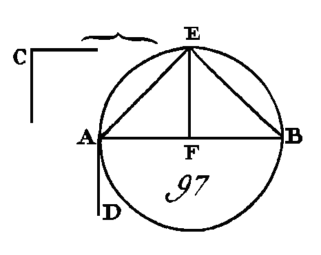 Supposons ensuite que l'angle C soit droit, et qu'il faille décrire sur la droite AB un segment de cercle qui reçoive un angle égal à l'angle droit C. Construisez un angle BAD égal à l'angle droit C (prop. 23. I), comme dans la figure 97 ; partagez la droite AB en deux parties égales au point F (prop. 10. I), et du centre F et avec un intervalle égal à l'une ou à l'autre des droites AF, FB, décrivez la circonférence de cercle AEB. La droite AD est tangente à la circonférence ABE (prop. 16. III), parce que l'angle BAD est droit, et l'angle BAD est égal à l'angle qui est compris dans le segment AEB, cap cet angle est droit, puisqu'il est compris dans un demi-cercle (prop. 31. III) ; mais l'angle BAD est égal à l'angle C : donc on a décrit sur la droite AB un segment de cercle AEB qui reçoit un angle égal à l'angle droit C.