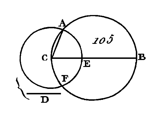 EUCLIDEÉLÉMENTS DE GÉOMÉTRIELIVRE IV.DÉFINITIONS.1. Une figure rectiligne est dite inscrite dans une figure rectiligne, lorsque chaque angle de la figure inscrite touche chaque côté de celle dans laquelle elle est inscrite. 2. Semblablement une figure est dite circonscrite à une figure, lorsque chaque côte de la figure circonscrite touche chaque angle de la figure autour de laquelle elle est circonscrite. 3. Une figure rectiligne est dite inscrite dans un cercle, lorsque chaque angle de la figure inscrite touche la circonférence de ce cercle. 4. Une figure rectiligne est dite circonscrite à un cercle, lorsque chaque côté de la figure circonscrite touche la circonférence de ce cercle. 5. Semblablement un cercle est dit inscrit dans une figure rectiligne, lorsque la circonférence du cercle touche chaque côté de la figure dans laquelle elle est inscrite. 6. Un cercle est dit circonscrit à une figure rectiligne, lorsque la circonférence du cercle touche chaque angle de la figure autour de laquelle elle est circonscrite. 7. Une droite est dite appliquée dans un cercle, lorsque ses extrémités sont dans la circonférence de ce cercle. PROPOSITION PREMIÈRE.PROBLÈME.Dans un cercle donné, appliquer une droite égale à une droite donnée qui ne soit pas plus grande que le diamètre. Soit ABC (fig. 105) le cercle donné, et D la droite donnée moins grande que le diamètre de ce cercle : il faut dans le cercle ABC appliquer une droite égale à la droite D.