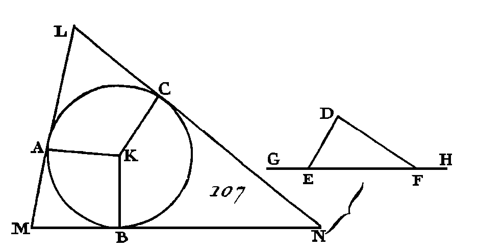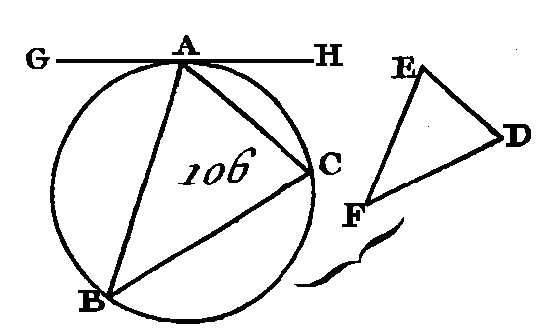 Conduisez la droite GAH de manière qu'elle touche le cercle ABC au point A, et sur la droite AH et au point A faites l'angle HAC égal à l'angle DEF (prop. 23, I). De plus, sur la droite GA et au point A faites l'angle GAB égal à l'angle FDE, et menez la droite BC. Puisque la droite HAG touche le cercle ABC et que la droite AG a été menée du point de contact, l'angle HAC est égal à celui qui est placé dans le segment alterne du cercle, c'est-à-dire à l'angle ABC (prop. 32. III) ; mais l'angle HAC est égal à l'angle DEF : donc l'angle ABC est égal à l'angle DEF. Par la même raison l'angle ACB est égal à l'angle FDE : donc l'angle restant. BAC sera égal à l'angle restant EFD (prop. 32. I) : donc le triangle ABC est équiangle au triangle DEF, et il est inscrit dans le cercle ABC (déf. 3. IV). Donc dans le cercle donné on a inscrit un triangle équiangle au triangle donné ; ce qu'il fallait faire. PROPOSITION III.PROBLÈME.Autour d'un cercle circonscrire un triangle équiangle à un triangle donné. Soit ABC (fig. 107) le cercle donné et DEF le triangle donné : il faut autour du cercle ABC circonscrire un triangle équiangle au triangle donné DEF.