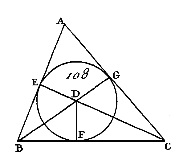 Prolongez la droite EF de part et d'autre vers les points H, G (dem. 2), prenez le centre K du cercle ABC (prop. 1. III) ; conduisez d'une manière quelconque la droite KB, faites sur la droite KB et au point K un angle BKA égal à l'angle DEG, et l'angle BKC égal à l'angle DFH (prop. 25. I) ; par les points A, B, C conduisez les droites LAM, MBN, NCL de manière qu'elles soient tangentes au cercle ABC (prop. 17. III). Puisque les droites LM, MN, NL touchent le cercle ABC aux points A, B, C et que les droites KA, KB, KC sont menées du centre K aux points A, B, C, les angles seront droits aux points A, B, C (prop. 18. III); et puisque les quatre angles du quadrilatère AMBK sont égaux à quatre angles droits (prop. 32. I), car ce quadrilatère peut se diviser en deux triangles; mais parmi les angles de ce quadrilatère, les angles KAM, KBM sont droits : donc les angles restants AKB, AMB seront égaux à deux angles droits ; mais les angles DEG, DEF sont égaux à deux droits (prop. 13. I) : donc les angles AKB, AMB sont égaux aux angles DEG, DEF ; mais l'angle DEG est égal à l'angle AKB : donc l'angle restant AMB sera égal à l'angle restant DEF. Nous démontrerons semblablement que l'angle LNM est égal à l'angle DFE : donc l'angle restant MLN est égal à l'angle EDF (prop. 32. I): donc le triangle LMN est équiangle avec le triangle DEF, et il est circonscrit autour du cercle ABC (déf. 4. IV). Donc un triangle équiangle avec un triangle donné a été circonscrit autour du cercle donné ; ce qu'il fallait faire. PROPOSITION IV.PROBLÈME.Inscrire une circonférence de cercle dans un triangle donné. Soit ABC (fig. 108) le triangle donné : il faut dans le triangle ABC inscrire un cercle. Partagez en deux parties égales les angles ABC, BCA par les droites BD, CD qui se rencontrent au point D, et du point D conduisez sur les droites AB, BC, CA les perpendiculaires DE, DF, DG (prop, 12. I).