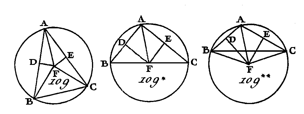 Puisque l'angle ABD est égal à l'angle CBD, car l'angle ABC a été partagé en deux parties égales, et que l'angle droit BED est égal à l'angle droit BFD, les deux triangles EBD, DBF auront deux angles égaux à deux angles et un côté égal à un côté, car BD, qui est opposé à deux angles égaux, est commun : donc ils auront les autres côtés égaux aux autres côtés (prop. 36. I) ; donc le côté DE sera égal au côté DF. Par la même raison le côté DG sera égal au côté DF: donc la circonférence décrite du point D avec un intervalle égal à une des droites DE, DF, DG passera par les autres points et touchera les droites AB, BC, CA, parce que les angles sont droits en E, F, G ; car si cette circonférence coupait ces droites, la perpendiculaire à l'extrémité d'un diamètre tomberait dans le cercle; ce qui est absurde (prop. 16. III). Donc la circonférence décrite du point D avec un intervalle égal à une des droites DE, DF, DG ne coupera point les droites AB, BC, CA : donc elle les touchera, et cette circonférence sera inscrite dans le triangle ABC (déf. 5. IV). Donc dans le triangle donné ABC on a inscrit la circonférence de cercle EFG ; ce qu'il fallait faire. PROPOSITION V.PROBLÈME.Autour d'un triangle donné décrire une circonférence de cercle. Soit ABC (fig. 109) le triangle donné : il faut autour du triangle donné ABC décrire une circonférence de cercle. Partagez les côtés AB, AC en deux parties égales aux points D, E (prop. 10. I), et des points D, E conduisez sur les droites AB, AC les perpendiculaires DF, EF (prop. 11. I) ; ces perpendiculaires se rencontreront ou dans le triangle ABC, ou dans la droite BC, ou hors du triangle ABC.