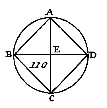 Supposons d'abord que ces perpendiculaires se rencontrent dans le triangle au point F; menez les droites BF, FC, FA; puisque la droite AD est égale à la droite DB, et que la perpendiculaire DF est commune, la base AF sera égale : la base FB (prop. 4. I). Nous démontrerons semblablement que la droite CF est égale à la droite FA : donc la droite BF est égale à la droite FC : donc les trois droites FA, FB, FC sont égales entre elles : donc si du centre F et avec un intervalle égal à une des droites FA, FB, FC on décrit une circonférence, cette circonférence passera par les autres points, et cette circonférence sera décrite autour du triangle ABC (déf. 6. 4); décrivez la circonférence ABC. Supposons actuellement, que les droites DF, EF se rencontrent dans la droite BC et au point F, comme dans la figure 109* ; menez la droite AF. Nous démontrerons semblablement que le point F est le centre de la circonférence circonscrite au triangle ABC. Supposons enfin que les droites DF, EF se rencontrent hors du triangle ABC, au point F comme dans la figure 109** ; menez les droites AF, FB, FC. Puisque la droite AD est égale à la droite DB et que la perpendiculaire DF est commune, la base AF sera égale à la base F B (prop. 4. I). Nous démontrerons semblablement que la droite CF est égale à la droite FA : donc la droite BF est égale à la droite FC: donc si du centre F et avec un intervalle égal à une des droites FA, FB, FC on décrit une circonférence, elle passera par les autres points, et cette circonférence sera circonscrite autour du triangle ABC ; décrivez donc la circonférence ABC. Donc une circonférence de cercle a été circonscrite autour du triangle donné ; ce qu'il fallait faire. COROLLAIRE.Il est évident que si le centre du cercle tombe dans le triangle, et si l'angle ABC est compris dans un segment plus grand qu'un demi-cercle, cet angle sera moindre qu'un angle droit. Si le centre du cercle tombe sur la droite BC, si cet angle est compris dans un demi-cercle, cet angle sera droit ; si enfin le centre du cercle tombe hors du triangle ABC, et si cet angle est compris dans un segment plus petit qu'un demi-cercle, cet angle sera plus grand qu'un angle droit : donc si le triangle donné est acutangle, les droites DE, EF se rencontreront dans le triangle ; si ce triangle a un angle droit BAC, les droites se rencontreront dans la droite BC ; si enfin cet angle a un angle obtus, ces droites se rencontreront hors du triangle ABC. PROPOSITION VI.PROBLÈME,Décrire un carré dans un cercle donné. Soit ABCD (fig. 110) le cercle donné : il faut décrire un carré dans le cercle ABCD. Conduisez les diamètres AC, BD du cercle ABCD de manière qu'ils soient perpendiculaires l'un sur l'autre (prop. 11. I) ; menez les droites AB, BC, CD, DA.