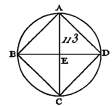 Coupez en deux parties égales l'une et l'autre des droites AB, AD aux points F, E (prop. 10. I), et par le point E conduisez la droite EH parallèle à l'une et à l'autre des droites AB, CD (prop. 31. I), et par le point F conduisez aussi la droite FK parallèle à l'une et à l'autre des droites AD, BC : donc chacune des figures AK, KB, AH, HD, AG, GC, BG, GD est un parallélogramme, et leurs côtés opposés sont égaux (prop. 34. ï). Puisque la droite AD est égale à la droite AB, que la droite AE est la moitié de AD et la droite AF la moitié de AB, la droite AE sera égale à la droite AF. Mais les côtés qui leur sont opposés sont égaux : donc la droite F G est égale à la droite GE. Nous démontrerons semblablement que les droites GH, GK sont égales aux droites FG, GE, chacune à chacune : donc les quatre droites. GE, GF, GH, GK sont égales entre elles : donc le cercle décrit du centre G avec un intervalle égal à une des droites GE, GF, GH, GK passera par les autres points, et sera tangent aux droites AB, BC, CD, DA, parce que les angles en E, F, H, K sont droits ; car si la circonférence coupait les droites AB, BC, CD, DA, la perpendiculaire à l'extrémité d'un diamètre entrerait dans le cercle ; ce qui est absurde (prop. 16. III) : donc la circonférence de cercle décrite du centre G avec un intervalle égal à une des droites GE, GF, GH, GK ne coupera point les droites AB, BC, CD, DA: donc elle sera tangente à ces droites, et elle sera inscrite dans le carré ABCD (déf. 5. IV). Donc on a inscrit une circonférence de cercle dans le carré donné ; ce qu'il fallait faire. PROPOSITION IX.PROBLÈME.Circonscrire un cercle à un carré donné. Soit ABCD (fig. 113) le carré donné : il faut à ce carré ABCD circonscrire une circonférence de cercle. Menez les droites AC, BD qui se coupent mutuellement au point E.
