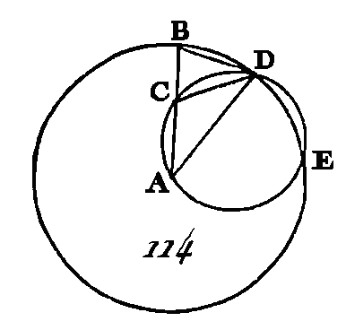 Puisque la droite DA est égale à la droite AB et que la droite A G est commune, les deux droites DA, AC sont égales aux deux droites BA, AC ; mais la base DC est égale à la base BC : donc l'angle DAC est égal à l'angle BAC (prop. 8. I): donc l'angle DAB est coupé en deux parties égales par la droite AC. Nous démontrerons semblablement que chacun des angles ABC BCD, CDA est coupé en deux parties égales par les droites AC, DB : donc puisque l'angle DAB est égal à l'angle ABC, que l'angle EAB est la moitié de l'angle DAB, et l'angle EBA la moitié de l'angle ABC, l'angle EAB sera égal à l'angle EBA : donc le côté EA est égal au côté EB (prop. 6. I). Nous démontrerons semblablement que les droites EC, ED sont égales aux droites EA, EB, chacune à chacune : donc les quatre droites EA, EB, EC, ED sont égales entre elles : donc la circonférence de cercle décrite du centre E avec un intervalle égal à une des droites EA, EB, ED passera par les autres points et elle sera circonscrite au carré ABCD ; circonscrivez le cercle ABCD. Donc on a circonscrit un cercle à un carré donné ; ce qu'il fallait faire. PROPOSITION X.PROBLÈME.Construire un triangle isocèle qui ait chacun des angles de sa base double du troisième angle. Soit la droite AB (fig. 114) ; que cette droite soit coupée en un point C de manière que le rectangle compris sous les droites AB, BC soit égal au carré de CA (prop. 11. II) ; du centre A et avec l'intervalle AB décrivez la circonférence BDE (dem. 3); dans le cercle BDE menez la corde BD égale à la droite AC qui est moindre que le diamètre de ce cercle (prop. 1. IV), et ayant conduit les droites DA, DC, circonscrivez la circonférence ACD au triangle ACD (prop. 5. IV).
