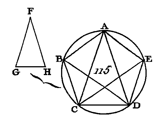 Puisque le rectangle compris sous les droites AB, BC est égal au carré de la droite AC et que la droite AC est égale à la droite BD, le rectangle compris sous les droites AB, BC sera égal au carré de BD : puisque le point B est pris hors du cercle ACD et que du point B on a mené un cercle ACD, les droites BCA, BD, dont l'une coupe le cercle et dont l'autre ne le coupe point, et puisque le rectangle compris sous les droites AB, BC est égal au carré de BD, la droite BD sera tangente au cercle ACD (prop. 37. III). Donc, puisque la droite BD est tangente et que la corde DC a été menée du point de contact D, l'angle BDC sera égal à celui qui est compris dans le segment alterne du cercle, c'est-à-dire à l'angle DAC (prop. 32. III). Mais, puisque l'angle BDC est égal à l'angle DAC, si nous ajoutons un angle commun CDA, l'angle total BDA sera égal aux deux angles CDA, DAC. Mais l'angle extérieur BCD est égal aux deux angles CDA, DAC (prop. 32. I): donc l’angle BDA est égal à l'angle BCD ; mais l'angle BDA est égal à l'angle CBD (prop. 5. I), puisque le côté AD est égal au côté AB ; donc l'angle DBA sera égal à l'angle BCD : donc les trois angles BDA, DBA, BCD sont égaux entre eux ; et puisque l'angle DBC est égal à l'angle BCD, le côté BD sera égal au côté DC (prop. 6. I); mais le côté BD est supposé égal au côté CA : donc le côté AC est égal au côté CD : donc l'angle CDA est égal à l'angle DAC (prop. 5. I) : donc les angles CDA, DAC, pris ensemble, sont double de l'angle DAC ; mais l'angle BCD est égal aux angles CDA, DAC (prop. 32. I) : donc l'angle BCD est double de l'angle DAC ; mais l'angle BCD est égal à chacun des angles BDA, DBA : donc chacun des angles BDA, DBA est double de l'angle DAB. Donc on a construit un triangle isocèle. ADB, dont chacun des angles de sa base BD est double du troisième angle ; ce qu'il fallait faire. PROPOSITION XI.PROBLÈME.Dans un cercle donné, inscrire un pentagone, équilatéral et équiangle. Soit ABCDE (fig. 115) le cercle donné : il faut inscrire dans ce cercle un pentagone équilatéral et équiangle Soit le triangle isocèle FGH, ayant, chacun des angles de sa base G, H double de l’angle E (prop. 10. IV). Inscrivez dans le cercle. ABCDE un triangle ACD équiangle avec le triangle FGH (prop. 2. IV), de manière que l'angle CAD soit égal à l'angle F, et de manière que chacun des angles ACB, CDA soit égal à chacun des angles G, H qui sont placés sur la base GH. Chacun des angles ACD, CDA sera double de l’angle CAD. Partagez chacun des angles ACD, CDA en deux parties égales par les droites CE, DB (prop. 9. I), et menez les droites AB, BC, DE, EA.