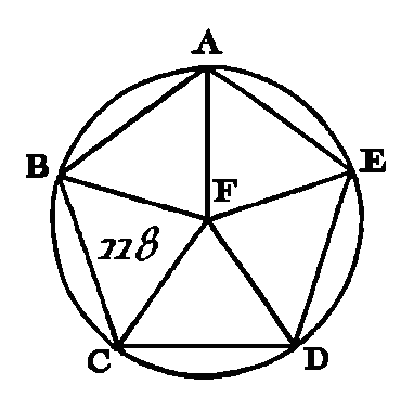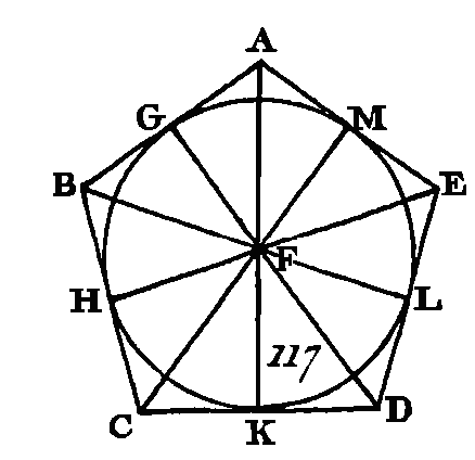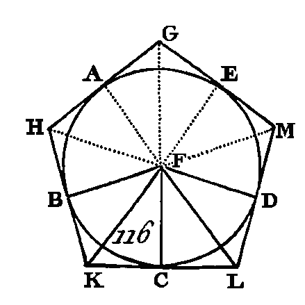 Puisque la droite KL touche le cercle ABCDE au point C, et que la droite FC a été menée du centre F au point de contact C, la droite F C sera perpendiculaire sur KL (prop. 18. III): donc chacun des angles FCK, FCL est droit; chacun des angles FBH, FBK, FDL, FDM est droit par la même raison. Puisque l'angle FCK est droit, le carré de la droite FK est égal aux carrés des droites FC, CK (prop. 47. I). Le carré de la droite FK est égal aux carrés des droites FB, BK, par la même raison : donc les carrés des droites FC, CK sont égaux aux carrés des droites FB, BK; mais le carré de la droite FC est égal au carré de la droite FB : donc le carré restant de la droite CK sera égal au carré restant de la droite BK : donc la droite CK est égale à la droite BK. Puisque la droite FB est égale à la droite FG et que la droite FK est commune, les deux droites BF, FK sont égales aux deux droites CF, FK ; mais la base BK est égale à la base CK : donc l'angle BFK est égal à l'angle KFC, et l'angle BKF à l'angle FKC (prop. 8. I) : donc l'angle BFC est double de l'angle KFC et l'angle BKC double de l'angle FKC. Par la même raison l'angle CFD est double de l'angle CFL, et l'angle CLD double de l'angle CLF. Puisque l'arc BC est égal à l'arc CD, l'angle BFC sera égal à l'angle CFD (prop. 27. III) ; mais l'angle BFC est double de l'angle KFC, et l'angle DFC double de l'angle LFC : donc l'angle KFC est égal à l'angle CFL : donc les deux triangles FKC, FLC ont deux angles égaux à deux angles, chacun à chacun, et un côté égal à un côté, puisque le côté FC leur est commun : donc ces deux triangles ont leurs autres côtés égaux aux autres côtés, et l'angle restant égal à l'angle restant (prop. 26. I) : donc la droite KC est égale à la droite CL, et l'angle FKC égal à l'angle FLC. La droite KL sera double de la droite KC, puisque la droite KC est égale à la droite CL. Par la même raison la droite HK sera double de la droite BK. De plus, puisqu'on a démontré que la droite BK est égale à la droite KC, que la droite KL est double de la droite KC et la droite HK double de la droite BK, la droite HK sera égale à la droite KL. Nous démontrerons semblablement que chacune des droites GH, GM, ML est égale à l'une ou à l'autre des droites HK, KL : donc le pentagone GHKLM est équilatéral. Je dis aussi qu'il est équiangle ; car puisque l'angle FKC est égal à l'angle FLC, et qu'on a démontré que l'angle HKL est double de l'angle FKC et l'angle KLM double aussi de l'angle FLC, l'angle HKL sera égal à l'angle KLM. Nous démontrerons par une raison semblable que chacun des angles KHG, HGM, GML est égal à l'un ou à l'autre des angles HKL, KLM : donc les cinq angles GHK, HKL, KLM, LMG, MGH sont égaux entre eux : donc le pentagone GHKLM est équiangle. Nous avons démontré qu'il est équilatéral, et il est circonscrit au cercle ABCDE ; ce qu'il fallait faire. PROPOSITION XIII.PROBLÈME.Dans un pentagone équilatéral et équiangle, inscrire un cercle. Soit ABCDE (fig. 117) le pentagone équilatéral et équiangle donné : il faut inscrire un cercle dans le pentagone ABCDE.