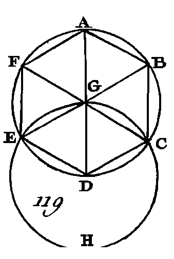 Partagez en deux parties égales chacun des angles BCD, CDE par les droites CF, FD (prop. 9. I), et du point F où ces droites se rencontrent, menez aux points B, A, E les droites FB, FA, FE. Nous démontrerons, comme dans la proposition précédente, que chacun des angles CBA, BAE, AED est coupé en deux parties égales par les droites BF, FA, FE. Puisque l'angle BCD est égal à l'angle CDE, et que l'angle FCD est la moitié de l'angle BCD, et l'angle CDF la moitié de l'angle CDE, l'angle FCD sera égal à l'angle FDC : donc le côté FC est égal au côté FD (prop. 6. I). On démontrera semblablement que chacune des droites FB, FA, FE est égale à chacune des droites FC, FD : donc les cinq droites FA, FB, FC, FD, FE sont égales entre elles : donc la circonférence décrite du point F et avec un intervalle égal à une des droites FA, FB, FC, FD, FE passera par les autres points et sera circonscrite au pentagone équilatéral et équiangle ABCDE. Décrivez la circonférence ABCDE. Donc une circonférence de cercle a été circonscrite à un pentagone équilatéral et équiangle ; ce qu'il fallait faire. PROPOSITION XV.PROBLÈME.Inscrire dans un cercle donné un hexagone équilatéral et équiangle. Soit ABCDEF (fig. 119) le cercle donné : il faut dans ce cercle inscrire un hexagone équilatéral et équiangle. Menez le diamètre AD du cercle ABCDEF, prenez le centre G de, ce cercle, et du centre D avec l'intervalle DG décrivez la circonférence EGCH (dem. 3) ; menez les droites EG, CG, prolongez-les vers les points B, F, et menez les droites AB, BC, CD, DE, EF, FA : je dis que l'hexagone ABCDEF est équilatéral et équiangle.